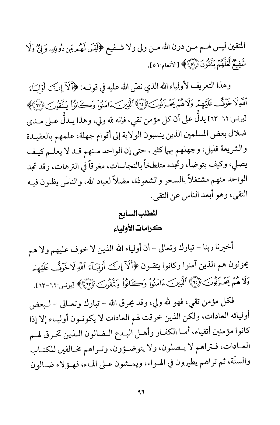 وهذا التعريف لأولياء الله الذي نصّ الله عليه في قوله: {أَلا إِنَّ أَوْلِيَاءَ اللَّهِ لا خَوْفُ عَلَيْهِمْ وَلا هُمْ يَحْزَنُونَ * الَّذِينَ آمَنُوا وَكَانُوا يَتَّقُونَ} [يونس: 62 - 63] يدلُّ على أن كل مؤمن تقي، فإنه لله ولي، وهذا يدلُّ على مدى ضلال بعض المسلمين الذين ينسبون الولاية إلى أقوام جهلة، علمهم بالعقيدة والشريعة قليل، وجهلهم بهما كثير، حتى إن الواحد منهم قد لا يعلم كيف يصلي، وكيف يتوضأ، وتجده متلطخاً بالنجاسات، مغرقاً في الترهات، وقد تجد الواحد منهم مشتغلاً بالسحر والشعوذة، مضلاً لعباد الله، والناس يظنون فيه التقى، وهو أبعد الناس عن التقى.