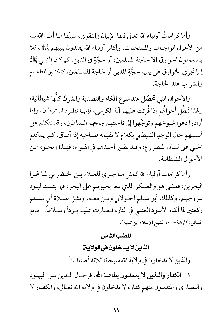 وأما كرامات أولياء الله تعالى فيها الإيمان والتقوى، سببها ما أمر الله به من الأعمال والواجبات والمستحبات، وأكابر أولياء الله يقتدون بنبيهم - صلى الله عليه وسلم -، فلا يستعملون الخوارق إلا لحاجة المسلمين، أو لحجَّةٍ في الدين، كما كان النبي - صلى الله عليه وسلم - إنما تجري الخوارق على يديه لحجَّةٍ للدين أو لحاجة المسلمين، كتكثير الطعام والشراب عند الحاجة.