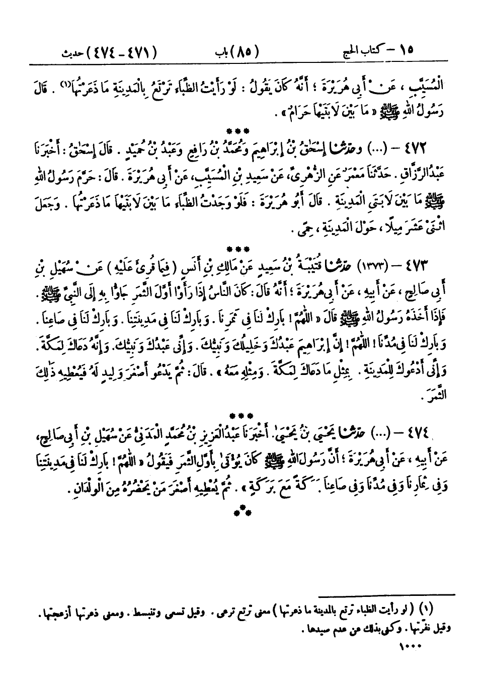 474 - (1373) حَدَّثَنَا يَحْيَى بْنُ يَحْيَى، أَخْبَرَنَا عَبْدُ الْعَزِيزِ بْنُ مُحَمَّدٍ الْمَدَنِيُّ، عَنْ سُهَيْلِ بْنِ أَبِي صَالِح، عَنْ أَبِيهِ، عَنْ أَبِي هُرَيْرَةَ، أَنَّ رَسُولَ اللهِ صَلَّى اللهُ عَلَيْهِ وَسَلَّمَ كَانَ يُؤْتَى بِأَوَّلِ الثَّمَرِ، فَيَقُولُ: «§اللهُمَّ بَارِكْ لَنَا فِي مَدِينَتِنَا، وَفِي ثِمَارِنَا، وَفِي مُدِّنَا، وَفِي صَاعِنَا بَرَكَةً مَعَ بَرَكَةٍ»، ثُمَّ يُعْطِيهِ أَصْغَرَ مَنْ يَحْضُرُهُ مِنَ الْوِلْدَانِ