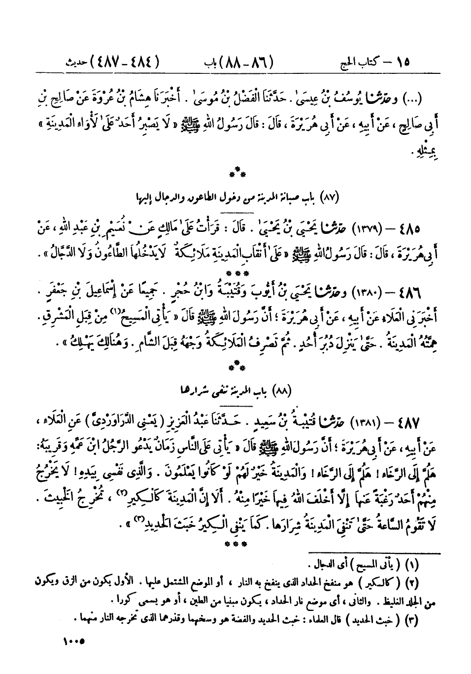 485 - (1379) حَدَّثَنَا يَحْيَى بْنُ يَحْيَى، قَالَ: قَرَأْتُ عَلَى مَالِكٍ، عَنْ نُعَيْمِ بْنِ عَبْدِ اللهِ، عَنْ أَبِي هُرَيْرَةَ، قَالَ: قَالَ رَسُولُ اللهِ صَلَّى اللهُ عَلَيْهِ وَسَلَّمَ: «§عَلَى أَنْقَابِ الْمَدِينَةِ مَلَائِكَةٌ، لَا يَدْخُلُهَا الطَّاعُونُ، وَلَا الدَّجَّالُ»