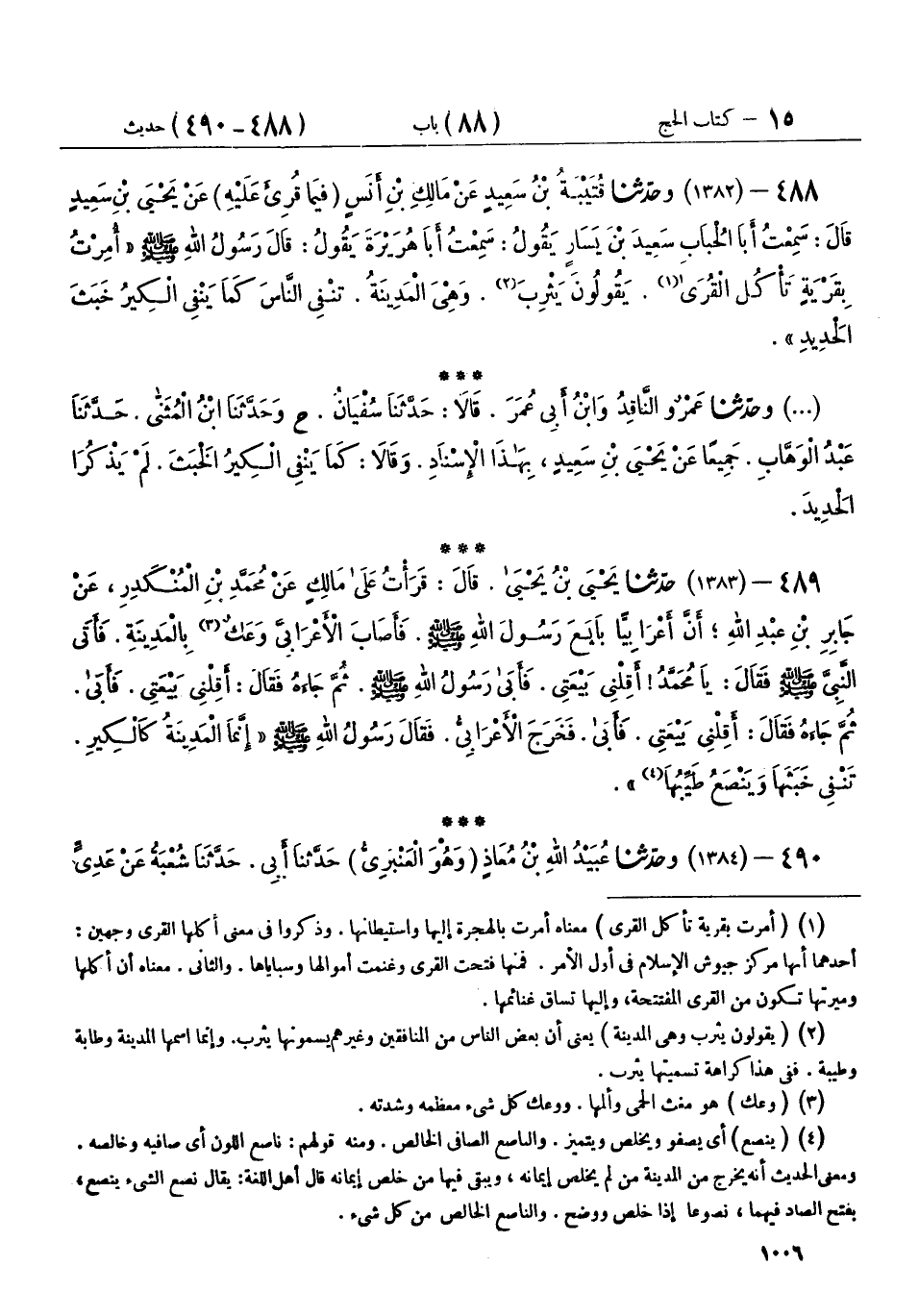 488 - (1382) وحَدَّثَنَا قُتَيْبَةُ بْنُ سَعِيدٍ، عَنْ مَالِكِ بْنِ أَنَسٍ، فِيمَا قُرِئَ عَلَيْهِ، عَنْ يَحْيَى بْنِ سَعِيدٍ، قَالَ: سَمِعْتُ أَبَا الْحُبَابِ سَعِيدَ بْنَ يَسَارٍ، يَقُولُ: سَمِعْتُ أَبَا هُرَيْرَةَ، يَقُولُ: قَالَ رَسُولُ اللهِ صَلَّى اللهُ عَلَيْهِ وَسَلَّمَ: " §أُمِرْتُ بِقَرْيَةٍ تَأْكُلُ الْقُرَى يَقُولُونَ: يَثْرِبَ، وَهِيَ الْمَدِينَةُ، تَنْفِي النَّاسَ كَمَا يَنْفِي الْكِيرُ خَبَثَ الْحَدِيدِ "،