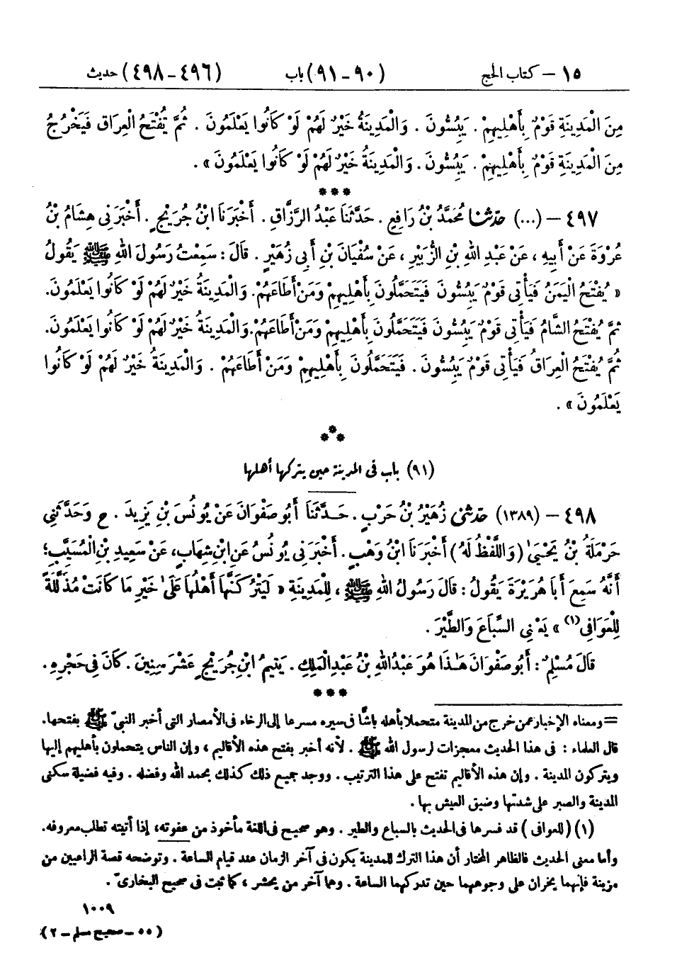 497 - (1388) حَدَّثَنَا مُحَمَّدُ بْنُ رَافِعٍ، حَدَّثَنَا عَبْدُ الرَّزَّاقِ، أَخْبَرَنَا ابْنُ جُرَيْجٍ، أَخْبَرَنِي هِشَامُ بْنُ عُرْوَةَ، عَنْ أَبِيهِ، عَنْ عَبْدِ اللهِ بْنِ الزُّبَيْرِ، عَنْ سُفْيَانَ بْنِ أَبِي زُهَيْرٍ، قَالَ: سَمِعْتُ رَسُولَ اللهِ صَلَّى اللهُ عَلَيْهِ وَسَلَّمَ، يَقُولُ: «§يُفْتَحُ الْيَمَنُ، فَيَأْتِي قَوْمٌ يَبُسُّونَ، فَيَتَحَمَّلُونَ بِأَهْلِيهِمْ وَمَنْ أَطَاعَهُمْ، وَالْمَدِينَةُ خَيْرٌ لَهُمْ لَوْ كَانُوا يَعْلَمُونَ، ثُمَّ يُفْتَحُ الشَّامُ، فَيَأْتِي قَوْمٌ يَبُسُّونَ، فَيَتَحَمَّلُونَ بِأَهْلِيهِمْ وَمَنْ أَطَاعَهُمْ، وَالْمَدِينَةُ خَيْرٌ لَهُمْ لَوْ كَانُوا يَعْلَمُونَ، ثُمَّ يُفْتَحُ الْعِرَاقُ، فَيَأْتِي قَوْمٌ يَبُسُّونَ، فَيَتَحَمَّلُونَ بِأَهْلِيهِمْ وَمَنْ أَطَاعَهُمْ، وَالْمَدِينَةُ خَيْرٌ لَهُمْ لَوْ كَانُوا يَعْلَمُونَ»