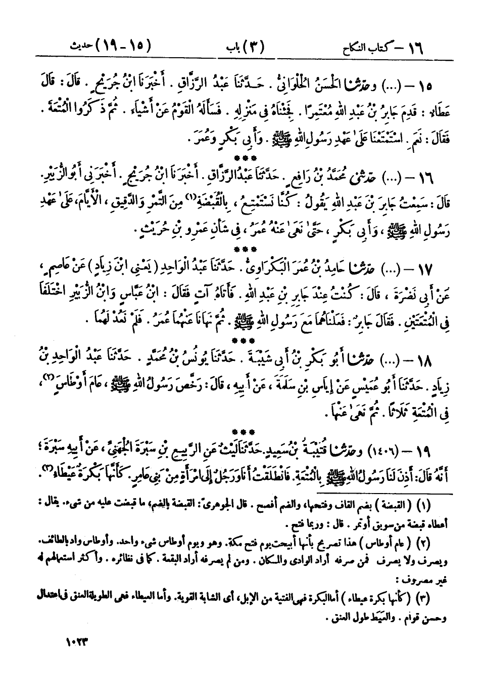 18 - (1405) حَدَّثَنَا أَبُو بَكْرِ بْنُ أَبِي شَيْبَةَ، حَدَّثَنَا يُونُسُ بْنُ مُحَمَّدٍ، حَدَّثَنَا عَبْدُ الْوَاحِدِ بْنُ زِيَادٍ، حَدَّثَنَا أَبُو عُمَيْسٍ، عَنْ إِيَاسِ بْنِ سَلَمَةَ، عَنْ أَبِيهِ، قَالَ: «§رَخَّصَ رَسُولُ اللهِ صَلَّى اللهُ عَلَيْهِ وَسَلَّمَ عَامَ أَوْطَاسٍ، فِي الْمُتْعَةِ ثَلَاثًا، ثُمَّ نَهَى عَنْهَا»