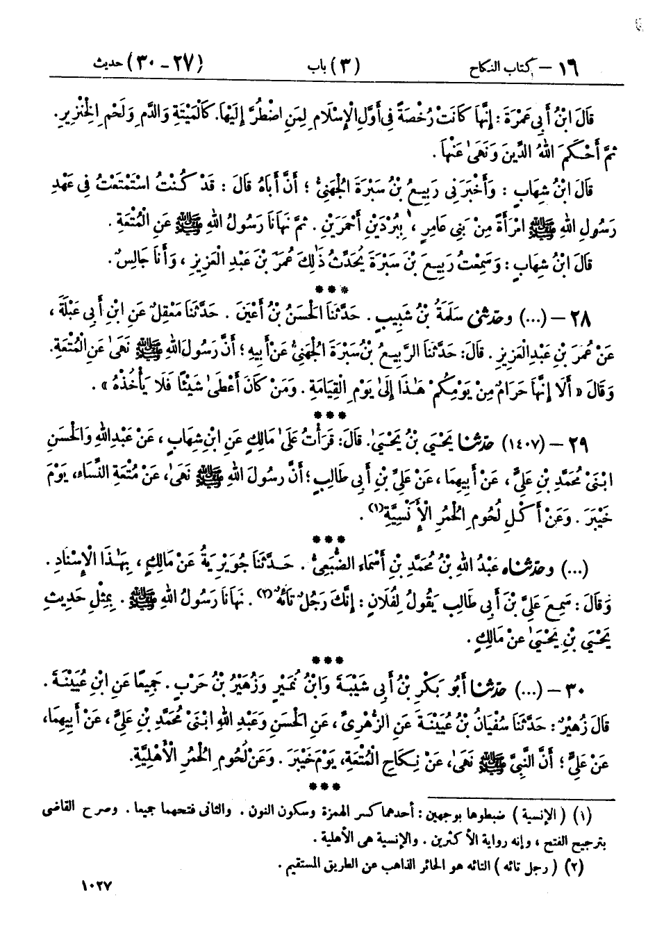 30 - (1407) حَدَّثَنَا أَبُو بَكْرِ بْنُ أَبِي شَيْبَةَ، وَابْنُ نُمَيْرٍ، وَزُهَيْرُ بْنُ حَرْبٍ، جَمِيعًا عَنِ ابْنِ عُيَيْنَةَ، قَالَ زُهَيْرٌ: حَدَّثَنَا سُفْيَانُ بْنُ عُيَيْنَةَ، عَنِ الزُّهْرِيِّ، عَنِ الْحَسَنِ، وَعَبْدِ اللهِ، ابْنَيْ مُحَمَّدِ بْنِ عَلِيٍّ، عَنْ أَبِيهِمَا، عَنْ عَلِيٍّ، «أَنَّ النَّبِيَّ صَلَّى اللهُ عَلَيْهِ وَسَلَّمَ §نَهَى عَنْ نِكَاحِ الْمُتْعَةِ يَوْمَ خَيْبَرَ، وَعَنْ لُحُومِ الْحُمُرِ الْأَهْلِيَّةِ»