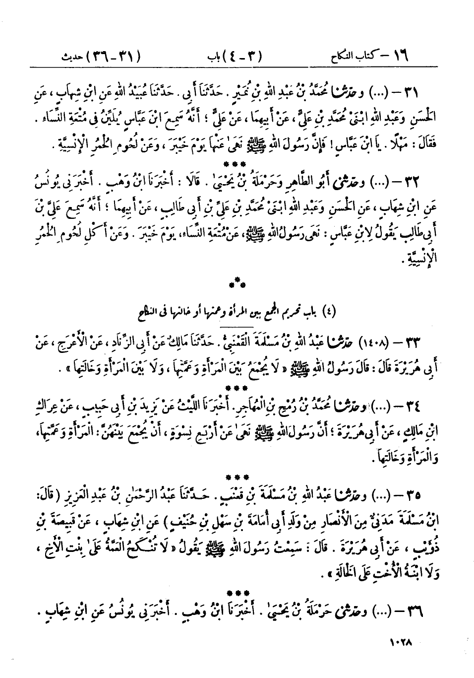 34 - (1408) وحَدَّثَنَا مُحَمَّدُ بْنُ رُمْحِ بْنِ الْمُهَاجِرِ، أَخْبَرَنَا اللَّيْثُ، عَنْ يَزِيدَ بْنِ أَبِي حَبِيبٍ، عَنْ عِرَاكِ بْنِ مَالِكٍ، عَنْ أَبِي هُرَيْرَةَ، " أَنَّ رَسُولَ اللهِ صَلَّى اللهُ عَلَيْهِ وَسَلَّمَ §نَهَى عَنْ أَرْبَعِ نِسْوَةٍ، أَنْ يُجْمَعَ بَيْنَهُنَّ: الْمَرْأَةِ وَعَمَّتِهَا، وَالْمَرْأَةِ وَخَالَتِهَا "