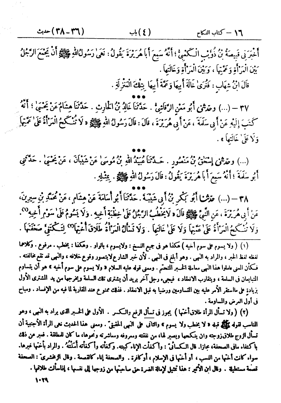 37 - (1408) وحَدَّثَنِي أَبُو مَعْنٍ الرَّقَاشِيُّ، حَدَّثَنَا خَالِدُ بْنُ الْحَارِثِ، حَدَّثَنَا هِشَامٌ، عَنْ يَحْيَى، أَنَّهُ كَتَبَ إِلَيْهِ عَنْ أَبِي سَلَمَةَ، عَنْ أَبِي هُرَيْرَةَ، قَالَ: قَالَ رَسُولُ اللهِ صَلَّى اللهُ عَلَيْهِ وَسَلَّمَ: «§لَا تُنْكَحُ الْمَرْأَةُ عَلَى عَمَّتِهَا، وَلَا عَلَى خَالَتِهَا»،