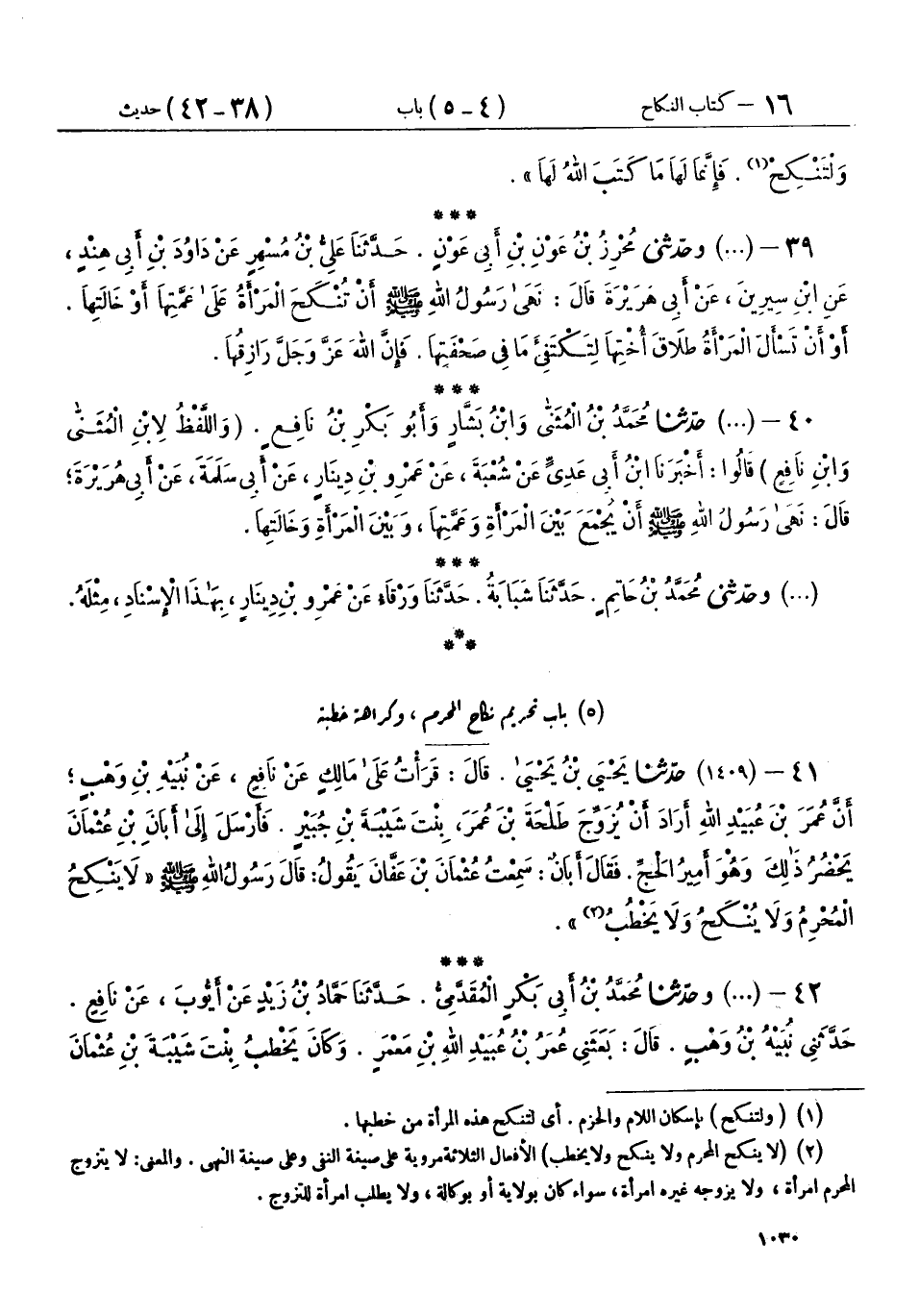 41 - (1409) حَدَّثَنَا يَحْيَى بْنُ يَحْيَى، قَالَ: قَرَأْتُ عَلَى مَالِكٍ، عَنْ نَافِعٍ، عَنْ نُبَيْهِ بْنِ وَهْبٍ، أَنَّ عُمَرَ بْنَ عُبَيْدِ اللهِ، أَرَادَ أَنْ يُزَوِّجَ طَلْحَةَ بْنَ عُمَرَ بِنْتَ شَيْبَةَ بْنِ جُبَيْرٍ، فَأَرْسَلَ إِلَى أَبَانَ بْنِ عُثْمَانَ يَحْضُرُ ذَلِكَ وَهُوَ أَمِيرُ الْحَجِّ، فَقَالَ أَبَانُ: سَمِعْتُ عُثْمَانَ بْنَ عَفَّانَ، يَقُولُ: قَالَ رَسُولُ اللهِ صَلَّى اللهُ عَلَيْهِ وَسَلَّمَ: «§لَا يَنْكِحُ الْمُحْرِمُ، وَلَا يُنْكَحُ، وَلَا يَخْطُبُ»