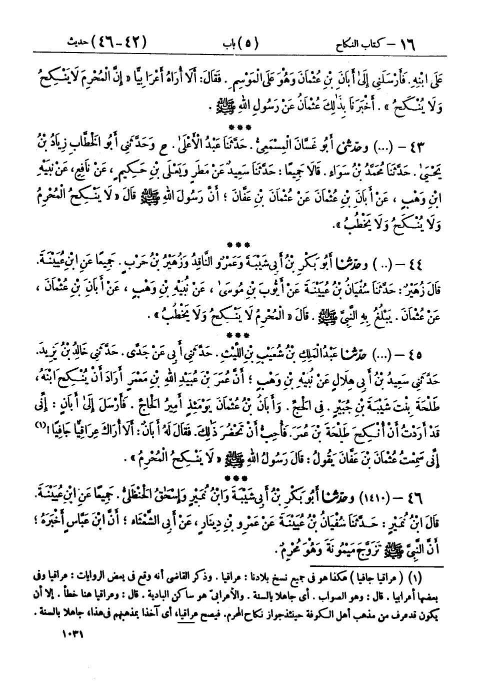 44 - (1409) وحَدَّثَنَا أَبُو بَكْرِ بْنُ أَبِي شَيْبَةَ، وَعَمْرٌو النَّاقِدُ، وَزُهَيْرُ بْنُ حَرْبٍ، جَمِيعًا عَنِ ابْنِ عُيَيْنَةَ، قَالَ زُهَيْرٌ: حَدَّثَنَا سُفْيَانُ بْنُ عُيَيْنَةَ، عَنْ أَيُّوبَ بْنِ مُوسَى، عَنْ نُبَيْهِ بْنِ وَهْبٍ، عَنْ أَبَانَ بْنِ عُثْمَانَ، عَنْ عُثْمَانَ، يَبْلُغُ بِهِ النَّبِيَّ صَلَّى اللهُ عَلَيْهِ وَسَلَّمَ، قَالَ: «§الْمُحْرِمُ لَا يَنْكِحُ، وَلَا يَخْطُبُ»