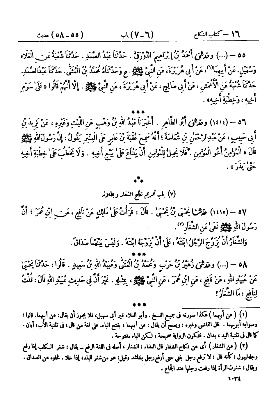 55 - (1413) وحَدَّثَنِي أَحْمَدُ بْنُ إِبْرَاهِيمَ الدَّوْرَقِيُّ، حَدَّثَنَا عَبْدُ الصَّمَدِ، حَدَّثَنَا شُعْبَةُ، عَنِ الْعَلَاءِ، وَسُهَيْلٍ، عَنْ أَبِيهِمَا، عَنْ أَبِي هُرَيْرَةَ، عَنِ النَّبِيِّ صَلَّى اللهُ عَلَيْهِ وَسَلَّمَ، ح وَحَدَّثَنَاهُ مُحَمَّدُ بْنُ الْمُثَنَّى، حَدَّثَنَا عَبْدُ الصَّمَدِ، حَدَّثَنَا شُعْبَةُ، عَنِ الْأَعْمَشِ، عَنْ أَبِي صَالِح، عَنْ أَبِي هُرَيْرَةَ، عَنِ النَّبِيِّ صَلَّى اللهُ عَلَيْهِ وَسَلَّمَ إِلَّا أَنَّهُمْ قَالُوا: «عَلَى سَوْمِ أَخِيهِ، وَخِطْبَةِ أَخِيهِ»