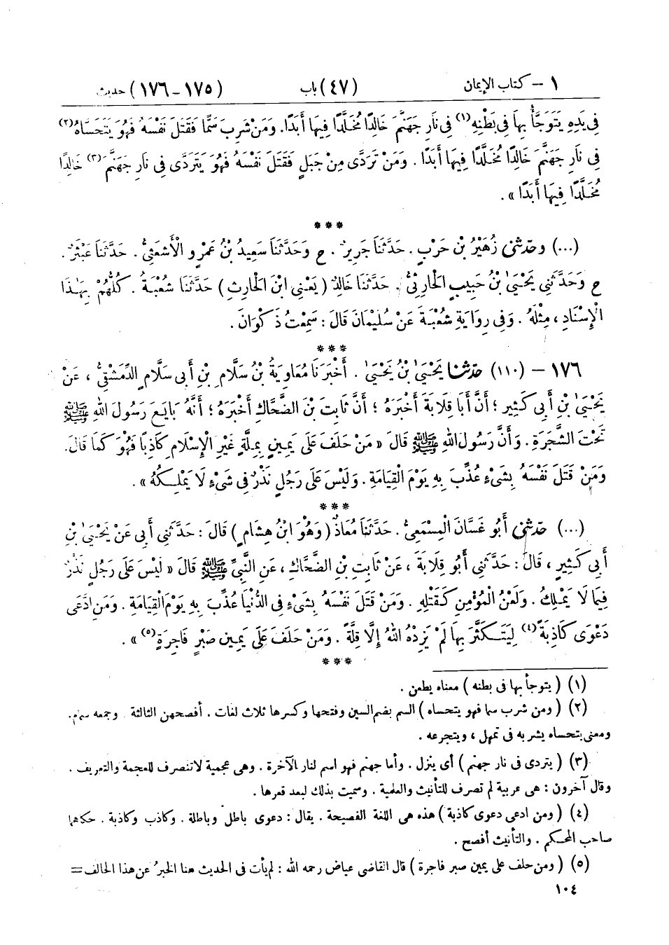 176 - (110) حَدَّثَنَا يَحْيَى بْنُ يَحْيَى، أَخْبَرَنَا مُعَاوِيَةُ بْنُ سَلَّامِ بْنِ أَبِي سَلَّامٍ الدِّمَشْقِيُّ، عَنْ يَحْيَى بْنِ أَبِي كَثِيرٍ، أَنَّ أَبَا قِلَابَةَ أَخْبَرَهُ أَنَّ ثَابِتَ بْنَ الضَّحَّاكِ، أَخْبَرَهُ أَنَّهُ بَايَعَ رَسُولُ اللهِ صَلَّى اللهُ عَلَيْهِ وَسَلَّمَ تَحْتَ الشَّجَرَةِ وَأَنَّ رَسُولَ اللهِ صَلَّى اللهُ عَلَيْهِ وَسَلَّمَ قَالَ: «§مَنْ حَلَفَ عَلَى يَمِينٍ بِمِلَّةٍ غَيْرِ الْإِسْلَامِ كَاذِبًا فَهُوَ كَمَا قَالَ، وَمَنْ قَتَلَ نَفْسَهُ بِشَيْءٍ عُذِّبَ بِهِ يَوْمَ الْقِيَامَةِ، وَلَيْسَ عَلَى رَجُلٍ نَذْرٌ فِي شَيْءٍ لَا يَمْلِكُهُ»