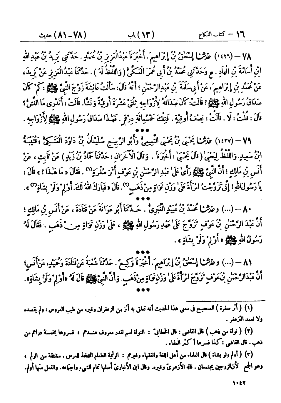 81 - (1427) وحَدَّثَنَا إِسْحَاقُ بْنُ إِبْرَاهِيمَ، أَخْبَرَنَا وَكِيعٌ، حَدَّثَنَا شُعْبَةُ، عَنْ قَتَادَةَ، وَحُمَيْدٍ، عَنْ أَنَسٍ، أَنَّ عَبْدَ الرَّحْمَنِ بْنَ عَوْفٍ تَزَوَّجَ امْرَأَةً عَلَى وَزْنِ نَوَاةٍ مِنْ ذَهَبٍ، وَأَنَّ النَّبِيَّ صَلَّى اللهُ عَلَيْهِ وَسَلَّمَ قَالَ لَهُ: «§أَوْلِمْ وَلَوْ بِشَاةٍ»،