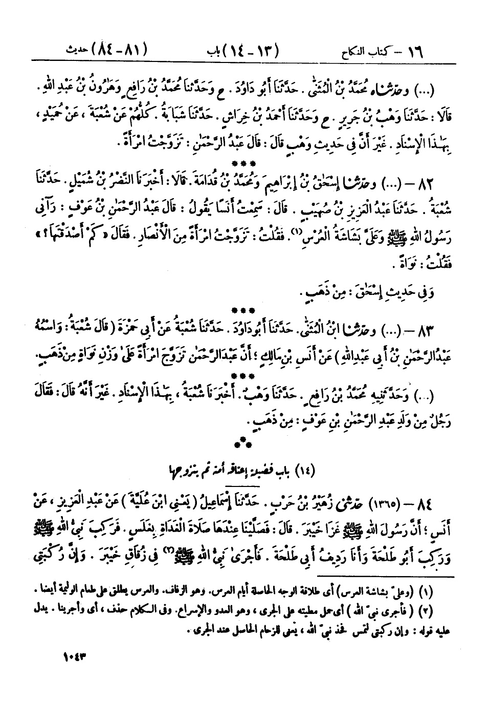 82 - (1427) حَدَّثَنَا إِسْحَاقُ بْنُ إِبْرَاهِيمَ، وَمُحَمَّدُ بْنُ قُدَامَةَ، قَالَا: أَخْبَرَنَا النَّضْرُ بْنُ شُمَيْلٍ، حَدَّثَنَا شُعْبَةُ، حَدَّثَنَا عَبْدُ الْعَزِيزِ بْنُ صُهَيْبٍ، قَالَ: سَمِعْتُ أَنَسًا، يَقُولُ: قَالَ عَبْدُ الرَّحْمَنِ بْنُ عَوْفٍ: رَآنِي رَسُولُ اللهِ صَلَّى اللهُ عَلَيْهِ وَسَلَّمَ وَعَلَيَّ بَشَاشَةُ الْعُرْسِ، فَقُلْتُ: تَزَوَّجْتُ امْرَأَةً مِنَ الْأَنْصَارِ، فَقَالَ: «§كَمْ أَصْدَقْتَهَا؟» فَقُلْتُ: نَوَاةً، وَفِي حَدِيثِ إِسْحَاقَ: مِنْ ذَهَبٍ