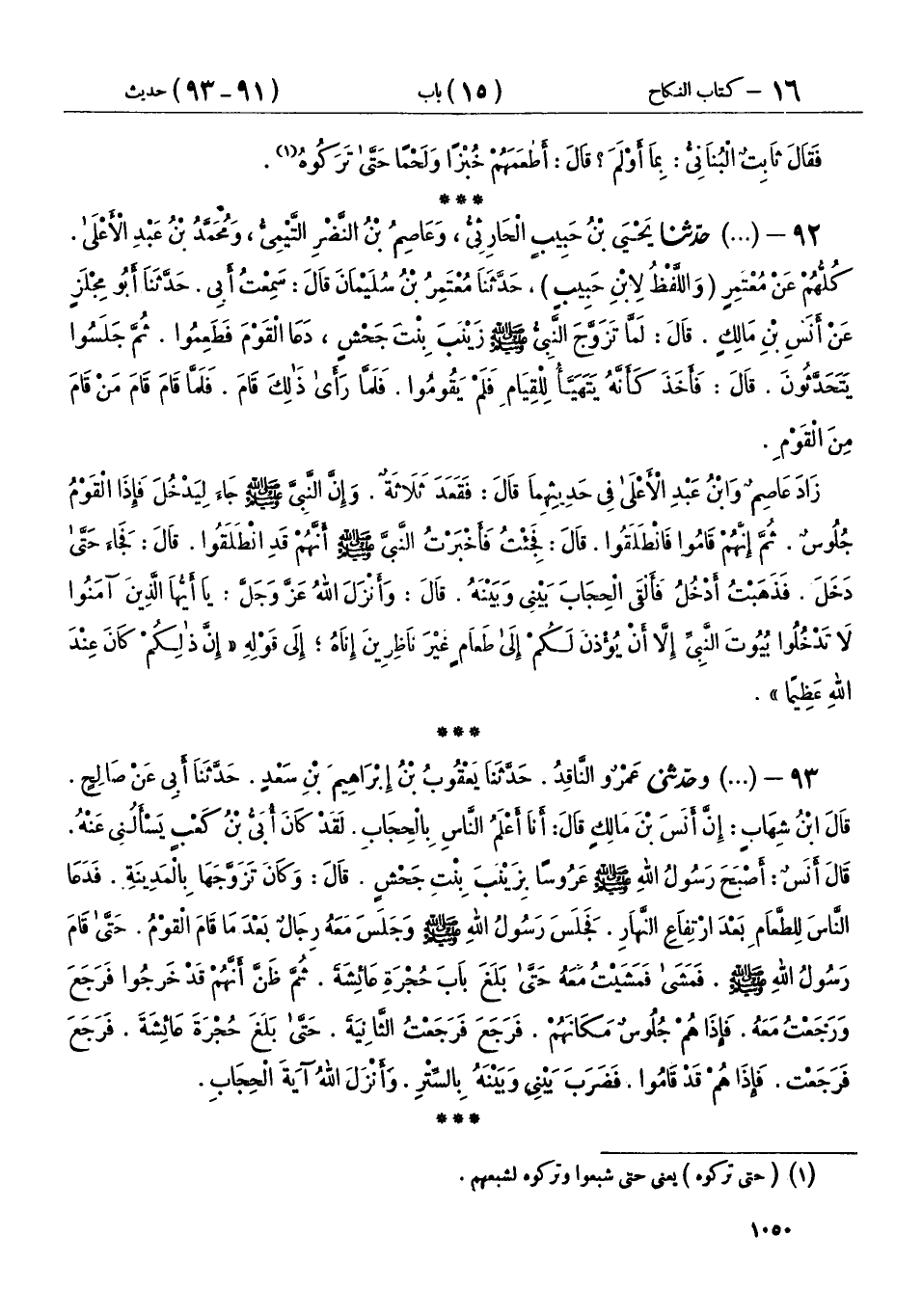 92 - (1428) حَدَّثَنَا يَحْيَى بْنُ حَبِيبٍ الْحَارِثِيُّ، وَعَاصِمُ بْنُ النَّضْرِ التَّيْمِيُّ، وَمُحَمَّدُ بْنُ عَبْدِ الْأَعْلَى، كُلُّهُمْ عَنْ مُعْتَمِرٍ، وَاللَّفْظُ لِابْنِ حَبِيبٍ، حَدَّثَنَا مُعْتَمِرُ بْنُ سُلَيْمَانَ، قَالَ: سَمِعْتُ أَبِي، حَدَّثَنَا أَبُو مِجْلَزٍ، عَنْ أَنَسِ بْنِ مَالِكٍ، قَالَ: «لَمَّا تَزَوَّجَ النَّبِيُّ صَلَّى اللهُ عَلَيْهِ وَسَلَّمَ زَيْنَبَ بِنْتَ جَحْشٍ، دَعَا الْقَوْمَ فَطَعِمُوا، ثُمَّ جَلَسُوا يَتَحَدَّثُونَ»، قَالَ: «فَأَخَذَ كَأَنَّهُ يَتَهَيَّأُ لِلْقِيَامِ، فَلَمْ يَقُومُوا، فَلَمَّا رَأَى ذَلِكَ قَامَ، فَلَمَّا قَامَ قَامَ مَنْ قَامَ مِنَ الْقَوْمِ» - زَادَ عَاصِمٌ، وَابْنُ عَبْدِ الْأَعْلَى فِي حَدِيثِهِمَا، قَالَ: فَقَعَدَ ثَلَاثَةٌ - «وَإِنَّ النَّبِيَّ صَلَّى اللهُ عَلَيْهِ وَسَلَّمَ جَاءَ لِيَدْخُلَ فَإِذَا الْقَوْمُ جُلُوسٌ، ثُمَّ إِنَّهُمْ قَامُوا فَانْطَلَقُوا»، قَالَ: «فَجِئْتُ فَأَخْبَرْتُ النَّبِيَّ صَلَّى اللهُ عَلَيْهِ وَسَلَّمَ أَنَّهُمْ قَدِ انْطَلَقُوا»، قَالَ: " فَجَاءَ حَتَّى دَخَلَ، فَذَهَبْتُ أَدْخُلُ، فَأَلْقَى الْحِجَابَ بَيْنِي وَبَيْنَهُ، قَالَ: وَأَنْزَلَ اللهُ عَزَّ وَجَلَّ {§يَا أَيُّهَا الَّذِينَ آمَنُوا لَا تَدْخُلُوا بُيُوتَ النَّبِيِّ إِلَّا أَنْ يُؤْذَنَ لَكُمْ إِلَى طَعَامٍ غَيْرَ نَاظِرِينَ إِنَاهُ} [الأحزاب: 53] إِلَى قَوْلِهِ {إِنَّ ذَلِكُمْ كَانَ عِنْدَ اللهِ عَظِيمًا} [الأحزاب: 53]