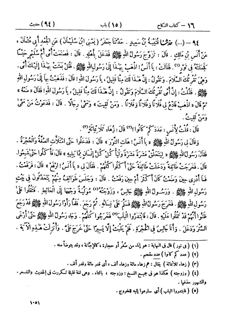 94 - (1428) حَدَّثَنَا قُتَيْبَةُ بْنُ سَعِيدٍ، حَدَّثَنَا جَعْفَرٌ يَعْنِي ابْنَ سُلَيْمَانَ، عَنِ الْجَعْدِ أَبِي عُثْمَانَ، عَنْ أَنَسِ بْنِ مَالِكٍ، قَالَ: تَزَوَّجَ رَسُولُ اللهِ صَلَّى اللهُ عَلَيْهِ وَسَلَّمَ، فَدَخَلَ بِأَهْلِهِ، قَالَ: فَصَنَعَتْ أُمِّي أُمُّ سُلَيْمٍ حَيْسًا، فَجَعَلَتْهُ فِي تَوْرٍ، فَقَالَتْ: يَا أَنَسُ، اذْهَبْ بِهَذَا إِلَى رَسُولِ اللهِ صَلَّى اللهُ عَلَيْهِ وَسَلَّمَ، فَقُلْ: بَعَثَتْ بِهَذَا إِلَيْكَ أُمِّي وَهِيَ تُقْرِئُكَ السَّلَامَ، وَتَقُولُ: إِنَّ هَذَا لَكَ مِنَّا قَلِيلٌ يَا رَسُولَ اللهِ، قَالَ: فَذَهَبْتُ بِهَا إِلَى رَسُولِ اللهِ صَلَّى اللهُ عَلَيْهِ وَسَلَّمَ، فَقُلْتُ: إِنَّ أُمِّي تُقْرِئُكَ السَّلَامَ، وَتَقُولُ: إِنَّ هَذَا لَكَ مِنَّا قَلِيلٌ يَا رَسُولَ اللهِ، فَقَالَ: «ضَعْهُ»، ثُمَّ قَالَ: «اذْهَبْ، فَادْعُ لِي فُلَانًا وَفُلَانًا وَفُلَانًا، وَمَنْ لَقِيتَ»، وَسَمَّى رِجَالًا، قَالَ: فَدَعَوْتُ مَنْ سَمَّى، وَمَنْ لَقِيتُ، قَالَ: قُلْتُ لِأَنَسٍ: عَدَدَ كَمْ كَانُوا؟ قَالَ: زُهَاءَ ثَلَاثِمِائَةٍ، وَقَالَ لِي رَسُولُ اللهِ صَلَّى اللهُ عَلَيْهِ وَسَلَّمَ: «يَا أَنَسُ، هَاتِ التَّوْرَ»، قَالَ: فَدَخَلُوا حَتَّى امْتَلَأَتِ الصُّفَّةُ وَالْحُجْرَةُ، فَقَالَ رَسُولُ اللهِ صَلَّى اللهُ عَلَيْهِ وَسَلَّمَ: «لِيَتَحَلَّقْ عَشَرَةٌ عَشَرَةٌ، وَلْيَأْكُلْ كُلُّ إِنْسَانٍ مِمَّا يَلِيهِ»، قَالَ: فَأَكَلُوا حَتَّى شَبِعُوا، قَالَ: فَخَرَجَتْ طَائِفَةٌ، وَدَخَلَتْ طَائِفَةٌ، حَتَّى أَكَلُوا كُلُّهُمْ، فَقَالَ لِي: «يَا أَنَسُ، ارْفَعْ»، قَالَ: فَرَفَعْتُ، فَمَا أَدْرِي حِينَ وَضَعْتُ كَانَ أَكْثَرَ، أَمْ حِينَ رَفَعْتُ، قَالَ: وَجَلَسَ طَوَائِفُ مِنْهُمْ يَتَحَدَّثُونَ فِي بَيْتِ رَسُولِ اللهِ صَلَّى اللهُ عَلَيْهِ وَسَلَّمَ، وَرَسُولُ اللهِ صَلَّى اللهُ عَلَيْهِ وَسَلَّمَ جَالِسٌ وَزَوْجَتُهُ مُوَلِّيَةٌ وَجْهَهَا إِلَى الْحَائِطِ، فَثَقُلُوا عَلَى رَسُولِ اللهِ صَلَّى اللهُ عَلَيْهِ وَسَلَّمَ، فَخَرَجَ رَسُولُ اللهِ صَلَّى اللهُ عَلَيْهِ وَسَلَّمَ، فَسَلَّمَ عَلَى نِسَائِهِ، ثُمَّ رَجَعَ، فَلَمَّا رَأَوْا رَسُولَ اللهِ صَلَّى اللهُ عَلَيْهِ وَسَلَّمَ قَدْ رَجَعَ، ظَنُّوا أَنَّهُمْ قَدْ ثَقُلُوا عَلَيْهِ، قَالَ: فَابْتَدَرُوا الْبَابَ، فَخَرَجُوا كُلُّهُمْ، وَجَاءَ رَسُولُ اللهِ صَلَّى اللهُ عَلَيْهِ وَسَلَّمَ، حَتَّى أَرْخَى السِّتْرَ، وَدَخَلَ وَأَنَا جَالِسٌ فِي الْحُجْرَةِ، فَلَمْ يَلْبَثْ إِلَّا يَسِيرًا حَتَّى خَرَجَ عَلَيَّ، وَأُنْزِلَتْ هَذِهِ الْآيَةُ، فَخَرَجَ رَسُولُ اللهِ صَلَّى اللهُ عَلَيْهِ وَسَلَّمَ، وَقَرَأَهُنَّ عَلَى النَّاسِ: {§يَا أَيُّهَا الَّذِينَ آمَنُوا لَا تَدْخُلُوا بُيُوتَ النَّبِيِّ إِلَّا أَنْ يُؤْذَنَ لَكُمْ إِلَى طَعَامٍ غَيْرَ نَاظِرِينَ إِنَاهُ وَلَكِنْ إِذَا دُعِيتُمْ فَادْخُلُوا فَإِذَا طَعِمْتُمْ فَانْتَشِرُوا وَلَا مُسْتَأْنِسِينَ لِحَدِيثٍ إِنَّ ذَلِكُمْ كَانَ يُؤْذِي النَّبِيَّ} [الأحزاب: 53] إِلَى آخِرِ الْآيَةِ قَالَ الْجَعْدُ: قَالَ أَنَسُ بْنُ مَالِكٍ: أَنَا أَحْدَثُ النَّاسِ عَهْدًا بِهَذِهِ الْآيَاتِ. وَحُجِبْنَ نِسَاءُ النَّبِيِّ صَلَّى اللهُ عَلَيْهِ وَسَلَّمَ