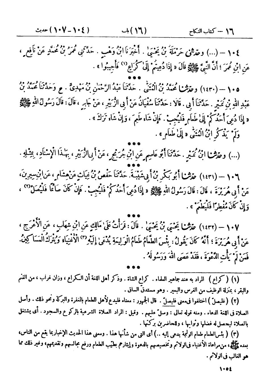 104 - (1429) وحَدَّثَنِي حَرْمَلَةُ بْنُ يَحْيَى، أَخْبَرَنَا ابْنُ وَهْبٍ، حَدَّثَنِي عُمَرُ بْنُ مُحَمَّدٍ، عَنْ نَافِعٍ، عَنِ ابْنِ عُمَرَ، أَنَّ النَّبِيَّ صَلَّى اللهُ عَلَيْهِ وَسَلَّمَ، قَالَ: «§إِذَا دُعِيتُمْ إِلَى كُرَاعٍ، فَأَجِيبُوا»