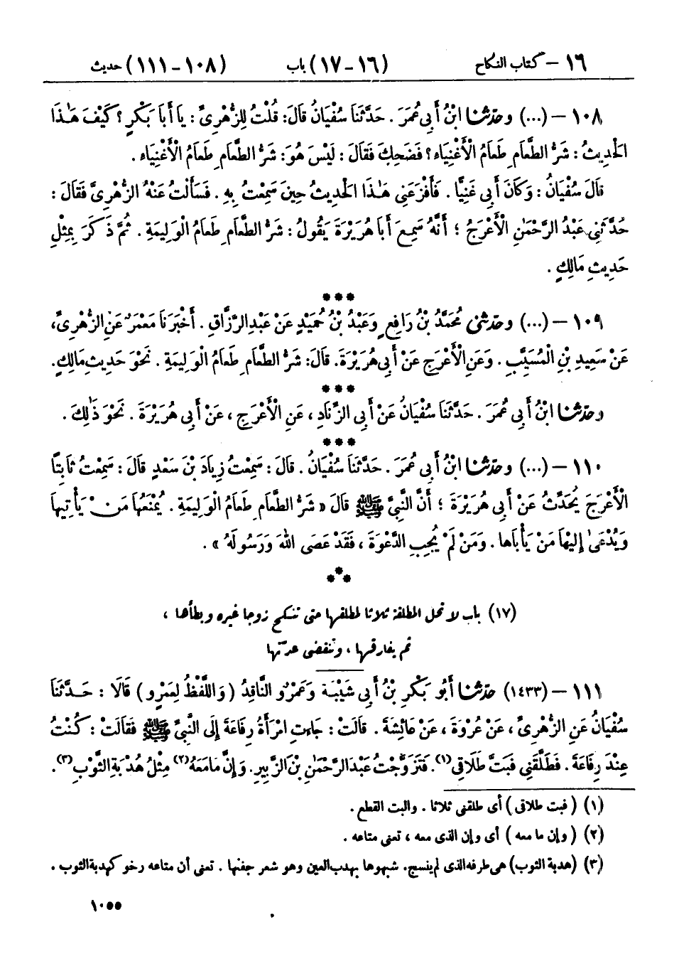 109 - (1432) وحَدَّثَنِي مُحَمَّدُ بْنُ رَافِعٍ، وَعَبْدُ بْنُ حُمَيْدٍ، عَنْ عَبْدِ الرَّزَّاقِ، أَخْبَرَنَا مَعْمَرٌ، عَنِ الزُّهْرِيِّ، عَنْ سَعِيدِ بْنِ الْمُسَيِّبِ، وَعَنِ الْأَعْرَجِ، عَنْ أَبِي هُرَيْرَةَ، قَالَ: شَرُّ الطَّعَامِ طَعَامُ الْوَلِيمَةِ نَحْوَ حَدِيثِ مَالِكٍ، وحَدَّثَنَا ابْنُ أَبِي عُمَرَ، حَدَّثَنَا سُفْيَانُ، عَنْ أَبِي الزِّنَادِ، عَنِ الْأَعْرَجِ، عَنْ أَبِي هُرَيْرَةَ، نَحْوَ ذَلِكَ