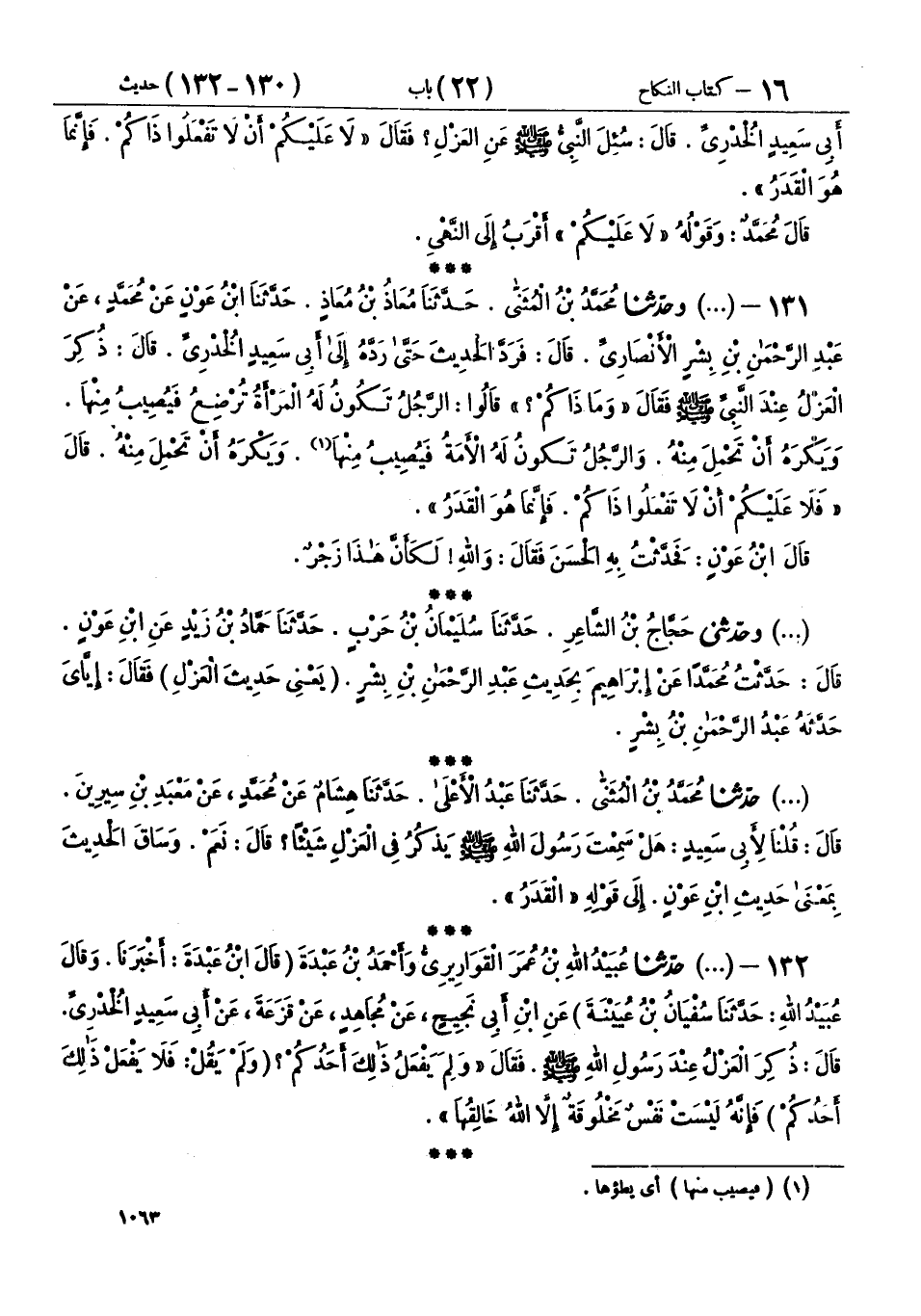 131 - (1438) وحَدَّثَنَا مُحَمَّدُ بْنُ الْمُثَنَّى، حَدَّثَنَا مُعَاذُ بْنُ مُعَاذٍ، حَدَّثَنَا ابْنُ عَوْنٍ، عَنْ مُحَمَّدٍ، عَنْ عَبْدِ الرَّحْمَنِ بْنِ بِشْرٍ الْأَنْصَارِيِّ، قَالَ: فَرَدَّ الْحَدِيثَ حَتَّى رَدَّهُ إِلَى أَبِي سَعِيدٍ الْخُدْرِيِّ قَالَ: ذُكِرَ الْعَزْلُ عِنْدَ النَّبِيِّ صَلَّى اللهُ عَلَيْهِ وَسَلَّمَ، فَقَالَ: «وَمَا ذَاكُمْ؟» قَالُوا: الرَّجُلُ تَكُونُ لَهُ الْمَرْأَةُ تُرْضِعُ، فَيُصِيبُ مِنْهَا، وَيَكْرَهُ أَنْ تَحْمِلَ مِنْهُ، وَالرَّجُلُ تَكُونُ لَهُ الْأَمَةُ فَيُصِيبُ مِنْهَا، وَيَكْرَهُ أَنْ تَحْمِلَ مِنْهُ، قَالَ: «فَلَا عَلَيْكُمْ أَنْ لَا تَفْعَلُوا ذَاكُمْ، §فَإِنَّمَا هُوَ الْقَدَرُ»، قَالَ ابْنُ عَوْنٍ: فَحَدَّثْتُ بِهِ الْحَسَنَ، فَقَالَ: وَاللهِ لَكَأَنَّ هَذَا زَجْرٌ.