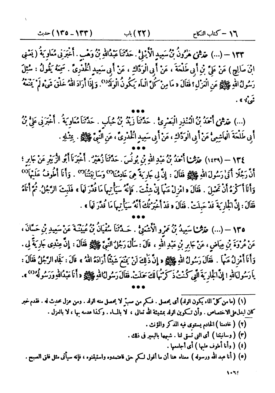 133 - (1438) حَدَّثَنِي هَارُونُ بْنُ سَعِيدٍ الْأَيْلِيُّ، حَدَّثَنَا عَبْدُ اللهِ بْنُ وَهْبٍ، أَخْبَرَنِي مُعَاوِيَةُ يَعْنِي ابْنَ صَالِحٍ، عَنْ عَلِيِّ بْنِ أَبِي طَلْحَةَ، عَنْ أَبِي الْوَدَّاكِ، عَنْ أَبِي سَعِيدٍ الْخُدْرِيِّ، سَمِعَهُ يَقُولُ: سُئِلَ رَسُولُ اللهِ صَلَّى اللهُ عَلَيْهِ وَسَلَّمَ، عَنِ الْعَزْلِ، فَقَالَ: «§مَا مِنْ كُلِّ الْمَاءِ يَكُونُ الْوَلَدُ، وَإِذَا أَرَادَ اللهُ خَلْقَ شَيْءٍ، لَمْ يَمْنَعْهُ شَيْءٌ»،