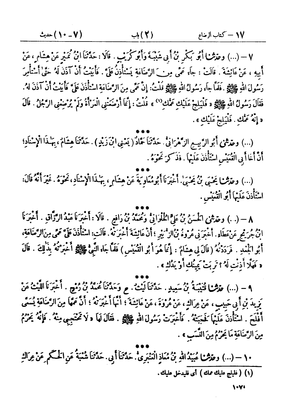 9 - (1445) حَدَّثَنَا قُتَيْبَةُ بْنُ سَعِيدٍ، حَدَّثَنَا لَيْثٌ، ح وحَدَّثَنَا مُحَمَّدُ بْنُ رُمْح، أَخْبَرَنَا اللَّيْثُ، عَنْ يَزِيدَ بْنِ أَبِي حَبِيبٍ، عَنْ عِرَاكٍ، عَنْ عُرْوَةَ، عَنْ عَائِشَةَ، أَنَّهَا أَخْبَرَتْهُ: أَنَّ عَمَّهَا مِنَ الرَّضَاعَةِ يُسَمَّى أَفْلَحَ. اسْتَأْذَنَ عَلَيْهَا فَحَجَبَتْهُ، فَأَخْبَرَتْ رَسُولَ اللهِ صَلَّى اللهُ عَلَيْهِ وَسَلَّمَ. فَقَالَ لَهَا: «§لَا تَحْتَجِبِي مِنْهُ، فَإِنَّهُ يَحْرُمُ مِنَ الرَّضَاعَةِ مَا يَحْرُمُ مِنَ النَّسَبِ»