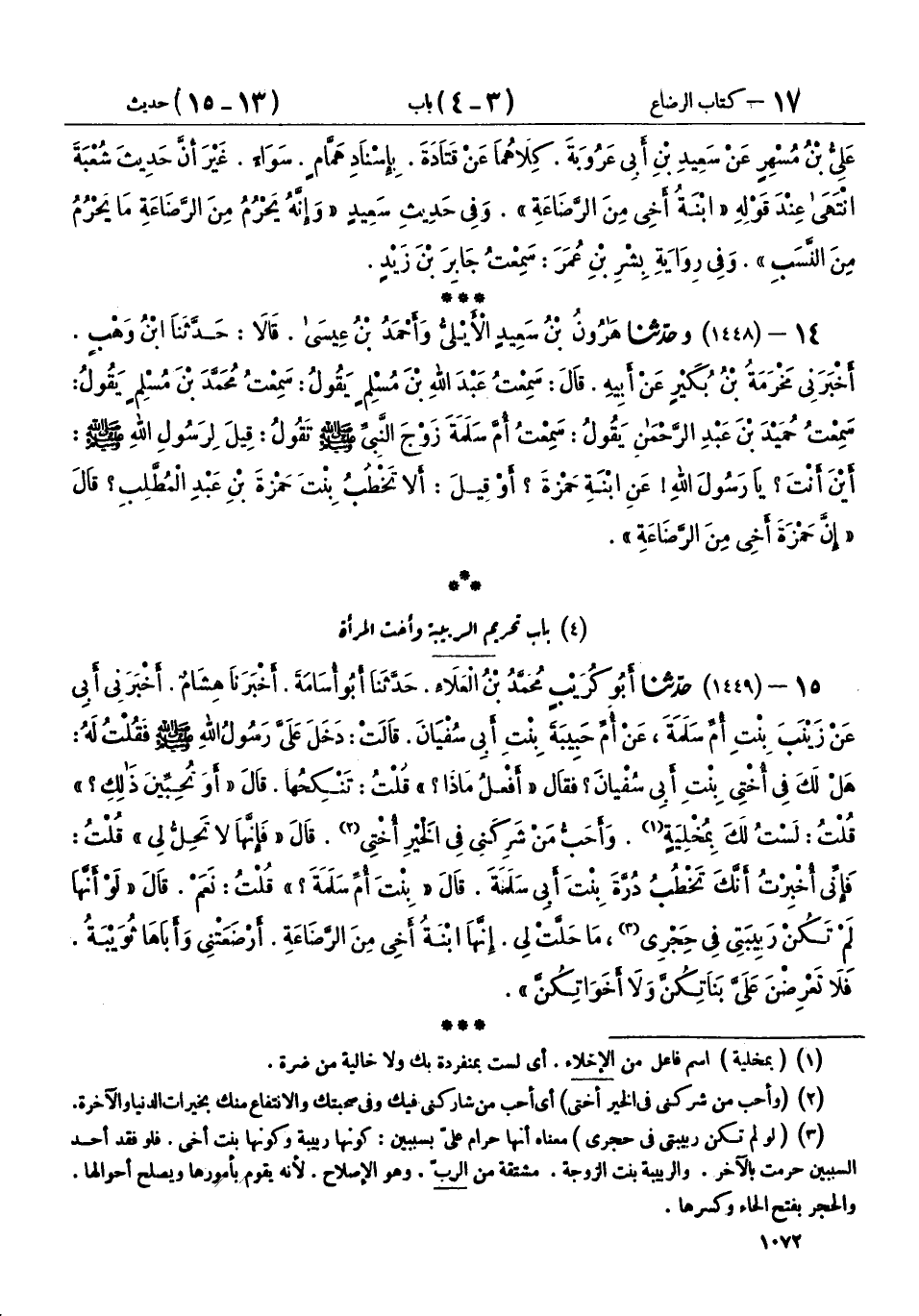 15 - (1449) حَدَّثَنَا أَبُو كُرَيْبٍ مُحَمَّدُ بْنُ الْعَلَاءِ، حَدَّثَنَا أَبُو أُسَامَةَ، أَخْبَرَنَا هِشَامٌ، أَخْبَرَنِي أَبِي، عَنْ زَيْنَبَ بِنْتِ أُمِّ سَلَمَةَ، عَنْ أُمِّ حَبِيبَةَ بِنْتِ أَبِي سُفْيَانَ، قَالَتْ: دَخَلَ عَلَيَّ رَسُولُ اللهِ صَلَّى اللهُ عَلَيْهِ وَسَلَّمَ، فَقُلْتُ لَهُ: هَلْ لَكَ فِي أُخْتِي بِنْتِ أَبِي سُفْيَانَ؟ فَقَالَ: «أَفْعَلُ مَاذَا؟» قُلْتُ: تَنْكِحُهَا، قَالَ: «أَوَ تُحِبِّينَ ذَلِكِ؟» قُلْتُ: لَسْتُ لَكَ بِمُخْلِيَةٍ، وَأَحَبُّ مَنْ شَرِكَنِي فِي الْخَيْرِ أُخْتِي، قَالَ: «فَإِنَّهَا لَا تَحِلُّ لِي»، قُلْتُ: فَإِنِّي أُخْبِرْتُ أَنَّكَ تَخْطُبُ دُرَّةَ بِنْتَ أَبِي سَلَمَةَ، قَالَ: «بِنْتَ أُمِّ سَلَمَةَ؟» قُلْتُ: نَعَمْ، قَالَ: «لَوْ أَنَّهَا لَمْ تَكُنْ رَبِيبَتِي فِي حِجْرِي مَا حَلَّتْ لِي، إِنَّهَا ابْنَةُ أَخِي مِنَ الرَّضَاعَةِ، أَرْضَعَتْنِي وَأَبَاهَا ثُوَيْبَةُ، §فَلَا تَعْرِضْنَ عَلَيَّ بَنَاتِكُنَّ، وَلَا أَخَوَاتِكُنَّ»،