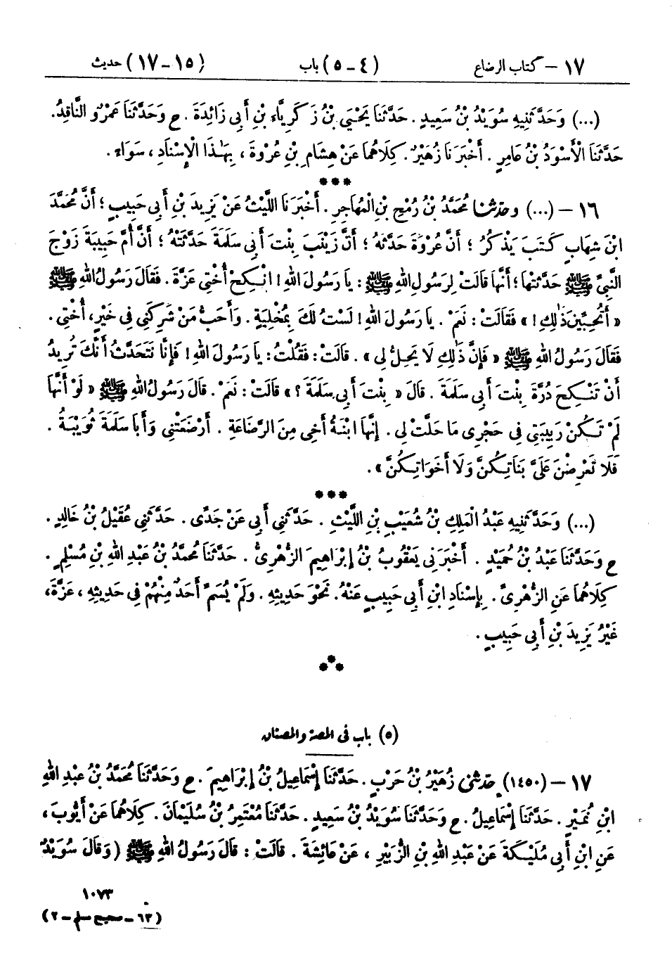 16 - (1449) وحَدَّثَنَا مُحَمَّدُ بْنُ رُمْحِ بْنِ الْمُهَاجِرِ، أَخْبَرَنَا اللَّيْثُ، عَنْ يَزِيدَ بْنِ أَبِي حَبِيبٍ، أَنَّ مُحَمَّدَ بْنَ شِهَابٍ، كَتَبَ يَذْكُرُ، أَنَّ عُرْوَةَ، حَدَّثَهُ، أَنَّ زَيْنَبَ بِنْتَ أَبِي سَلَمَةَ، حَدَّثَتْهُ، أَنَّ أُمَّ حَبِيبَةَ زَوْجَ النَّبِيِّ صَلَّى اللهُ عَلَيْهِ وَسَلَّمَ حَدَّثَتْهَا، أَنَّهَا قَالَتْ لِرَسُولِ اللهِ صَلَّى اللهُ عَلَيْهِ وَسَلَّمَ: يَا رَسُولَ اللهِ، انْكِحْ أُخْتِي عَزَّةَ، فَقَالَ رَسُولُ اللهِ صَلَّى اللهُ عَلَيْهِ وَسَلَّمَ: «أَتُحِبِّينَ ذَلِكِ؟» فَقَالَتْ: نَعَمْ، يَا رَسُولَ اللهِ، لَسْتُ لَكَ بِمُخْلِيَةٍ، وَأَحَبُّ مَنْ شَرِكَنِي فِي خَيْرٍ أُخْتِي، فَقَالَ رَسُولُ اللهِ صَلَّى اللهُ عَلَيْهِ وَسَلَّمَ: «فَإِنَّ ذَلِكِ لَا يَحِلُّ لِي»، قَالَتْ: فَقُلْتُ: يَا رَسُولَ اللهِ، فَإِنَّا نَتَحَدَّثُ أَنَّكَ تُرِيدُ أَنْ تَنْكِحَ دُرَّةَ بِنْتَ أَبِي سَلَمَةَ، قَالَ: «بِنْتَ أَبِي سَلَمَةَ؟» قَالَتْ: نَعَمْ، قَالَ: رَسُولُ اللهِ صَلَّى اللهُ عَلَيْهِ وَسَلَّمَ: «لَوْ أَنَّهَا لَمْ تَكُنْ رَبِيبَتِي فِي حِجْرِي مَا حَلَّتْ لِي، إِنَّهَا ابْنَةُ أَخِي مِنَ الرَّضَاعَةِ، أَرْضَعَتْنِي وَأَبَا سَلَمَةَ ثُوَيْبَةُ §فَلَا تَعْرِضْنَ عَلَيَّ بَنَاتِكُنَّ وَلَا أَخَوَاتِكُنَّ»،