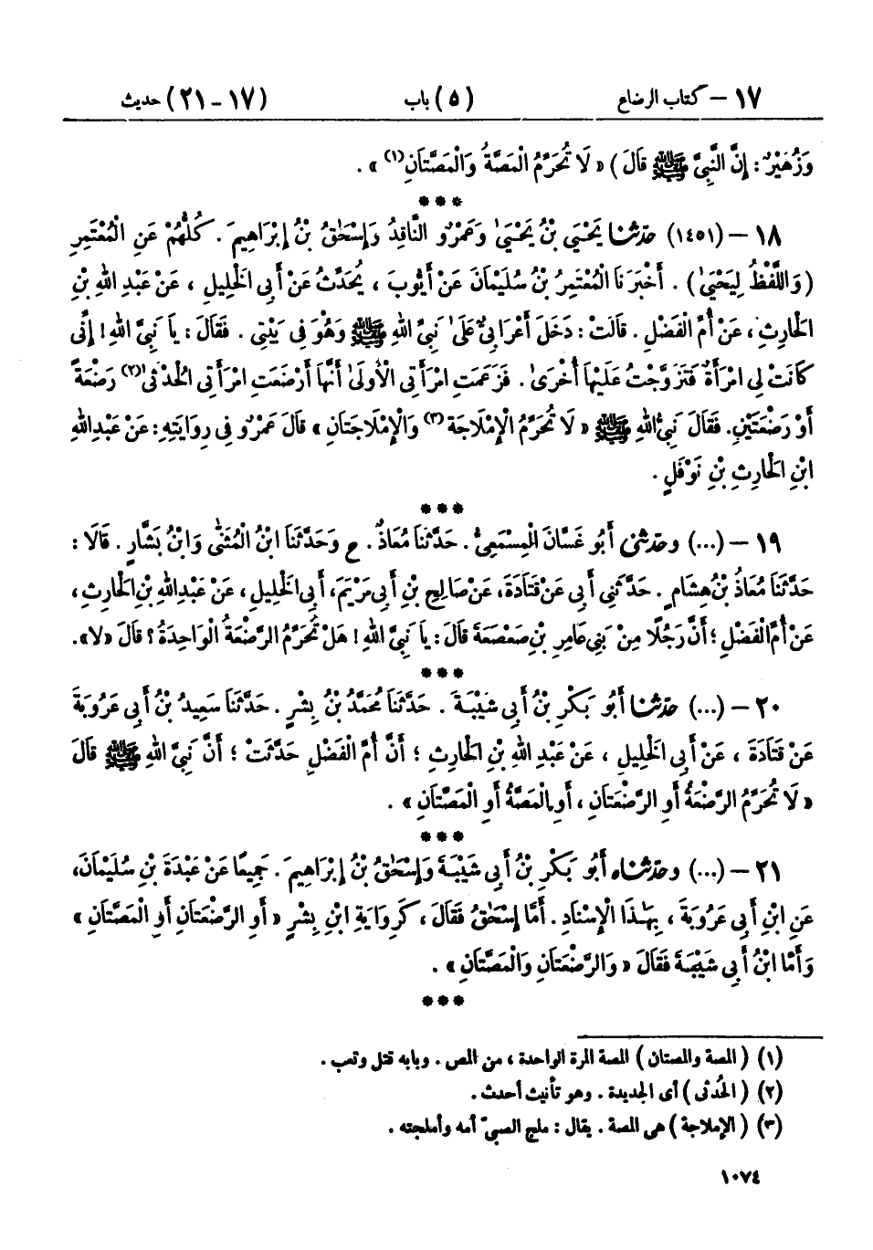 18 - (1451) حَدَّثَنَا يَحْيَى بْنُ يَحْيَى، وَعَمْرٌو النَّاقِدُ، وَإِسْحَاقُ بْنُ إِبْرَاهِيمَ، كُلُّهُمْ عَنِ الْمُعْتَمِرِ، وَاللَّفْظُ لِيَحْيَى، أَخْبَرَنَا الْمُعْتَمِرُ بْنُ سُلَيْمَانَ، عَنْ أَيُّوبَ، يُحَدِّثُ عَنْ أَبِي الْخَلِيلِ، عَنْ عَبْدِ اللهِ بْنِ الْحَارِثِ، عَنْ أُمِّ الْفَضْلِ، قَالَتْ: دَخَلَ أَعْرَابِيٌّ عَلَى نَبِيِّ اللهِ صَلَّى اللهُ عَلَيْهِ وَسَلَّمَ، وَهُوَ فِي بَيْتِي، فَقَالَ: يَا نَبِيَّ اللهِ، إِنِّي كَانَتْ لِي امْرَأَةٌ، فَتَزَوَّجْتُ عَلَيْهَا أُخْرَى، فَزَعَمَتِ امْرَأَتِي الْأُولَى أَنَّهَا أَرْضَعَتِ امْرَأَتِي الْحُدْثَى رَضْعَةً أَوْ رَضْعَتَيْنِ، فَقَالَ نَبِيُّ اللهِ صَلَّى اللهُ عَلَيْهِ وَسَلَّمَ: «§لَا تُحَرِّمُ الْإِمْلَاجَةُ وَالْإِمْلَاجَتَانِ»، قَالَ عَمْرٌو فِي رِوَايَتِهِ: عَنْ عَبْدِ اللهِ بْنِ الْحَارِثِ بْنِ نَوْفَلٍ