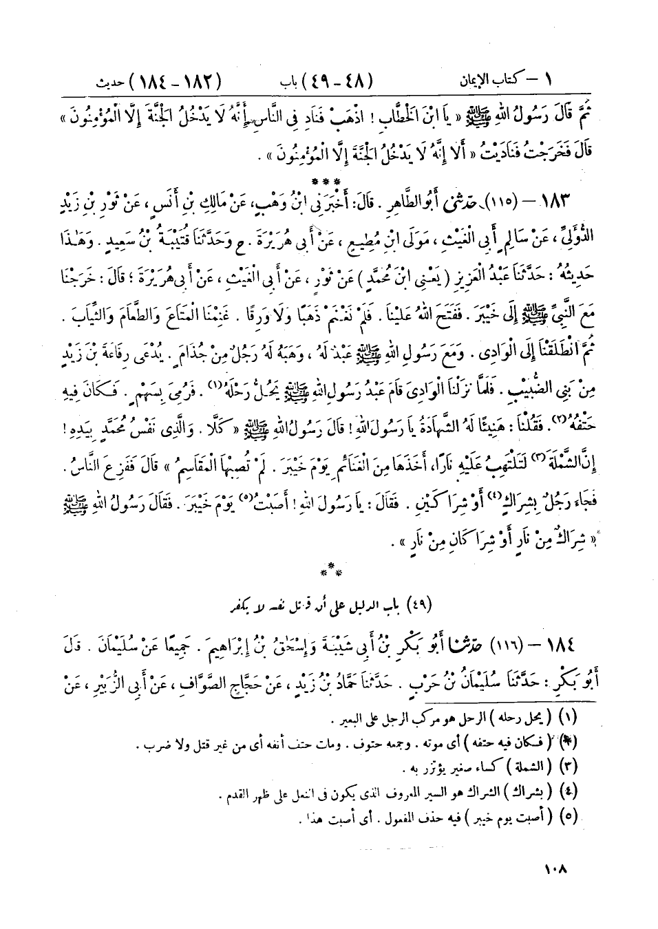 183 - (115) حَدَّثَنِي أَبُو الطَّاهِرِ، قَالَ: أَخْبَرَنِي ابْنُ وَهْبٍ، عَنْ مَالِكِ بْنِ أَنَسٍ، عَنْ ثَوْرِ بْنِ زَيْدٍ الدُّؤَلِيِّ، عَنْ سَالِمٍ أَبِي الْغَيْثِ، مَوْلَى ابْنِ مُطِيعٍ، عَنْ أَبِي هُرَيْرَةَ، ح وَحَدَّثَنَا قُتَيْبَةُ بْنُ سَعِيدٍ، وَهَذَا حَدِيثُهُ: حَدَّثَنَا عَبْدُ الْعَزِيزِ يَعْنِي ابْنَ مُحَمَّدٍ، عَنْ ثَوْرٍ، عَنْ أَبِي الْغَيْثِ، عَنْ أَبِي هُرَيْرَةَ، قَالَ: خَرَجْنَا مَعَ النَّبِيِّ صَلَّى اللهُ عَلَيْهِ وَسَلَّمَ إِلَى خَيْبَرَ، فَفَتَحَ اللهُ عَلَيْنَا فَلَمْ نَغْنَمْ ذَهَبًا وَلَا وَرِقًا، غَنِمْنَا الْمَتَاعَ وَالطَّعَامَ وَالثِّيَابَ، ثُمَّ انْطَلَقْنَا إِلَى الْوَادِي، وَمَعَ رَسُولِ اللهِ صَلَّى اللهُ عَلَيْهِ وَسَلَّمَ عَبْدٌ لَهُ، وَهَبَهُ لَهُ رَجُلٌ مِنْ جُذَامٍ يُدْعَى رِفَاعَةَ بْنَ زَيْدٍ مِنْ بَنِي الضُّبَيْبِ، فَلَمَّا نَزَلْنَا الْوَادِيَ، قَامَ عَبْدُ رَسُولِ اللهِ صَلَّى اللهُ عَلَيْهِ وَسَلَّمَ يَحُلُّ رَحْلَهُ، فَرُمِيَ بِسَهْمٍ، فَكَانَ فِيهِ حَتْفُهُ، فَقُلْنَا: هَنِيئًا لَهُ الشَّهَادَةُ يَا رَسُولَ اللهِ، قَالَ رَسُولُ اللهِ صَلَّى اللهُ عَلَيْهِ وَسَلَّمَ: «كَلَّا وَالَّذِي نَفْسُ مُحَمَّدٍ بِيَدِهِ، إِنَّ §الشِّمْلَةَ لَتَلْتَهِبُ عَلَيْهِ نَارًا أَخَذَهَا مِنَ الْغَنَائِمِ يَوْمَ خَيْبَرَ لَمْ تُصِبْهَا الْمَقَاسِمُ»، قَالَ: فَفَزِعَ النَّاسُ، فَجَاءَ رَجُلٌ بِشِرَاكٍ أَوْ شِرَاكَيْنِ فَقَالَ: يَا رَسُولَ اللهِ، أَصَبْتُ يَوْمَ خَيْبَرَ، فَقَالَ رَسُولُ اللهِ صَلَّى اللهُ عَلَيْهِ وَسَلَّمَ: «شِرَاكٌ مِنْ نَارٍ أَوْ شِرَاكَانِ مِنْ نَارٍ»