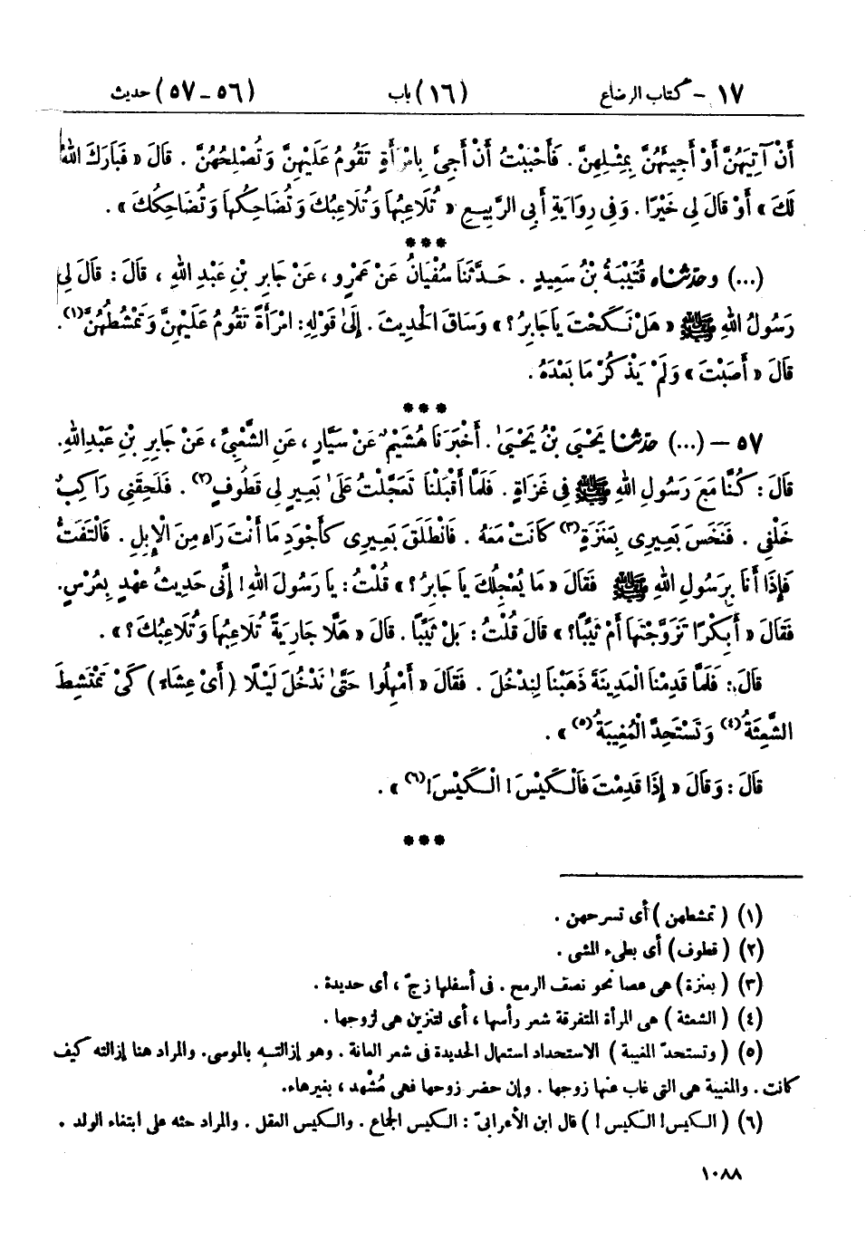 57 - (715) حَدَّثَنَا يَحْيَى بْنُ يَحْيَى، أَخْبَرَنَا هُشَيْمٌ، عَنْ سَيَّارٍ، عَنِ الشَّعْبِيِّ، عَنْ جَابِرِ بْنِ عَبْدِ اللهِ قَالَ: كُنَّا مَعَ رَسُولِ اللهِ صَلَّى اللهُ عَلَيْهِ وَسَلَّمَ فِي غَزَاةٍ، فَلَمَّا أَقْبَلْنَا تَعَجَّلْتُ عَلَى بَعِيرٍ لِي قَطُوفٍ، فَلَحِقَنِي رَاكِبٌ خَلْفِي، فَنَخَسَ بَعِيرِي بِعَنَزَةٍ كَانَتْ مَعَهُ، فَانْطَلَقَ بَعِيرِي كَأَجْوَدِ مَا أَنْتَ رَاءٍ مِنَ الْإِبِلِ، فَالْتَفَتُّ، فَإِذَا أَنَا بِرَسُولِ اللهِ صَلَّى اللهُ عَلَيْهِ وَسَلَّمَ، فَقَالَ: «مَا يُعْجِلُكَ يَا جَابِرُ؟» قُلْتُ: يَا رَسُولَ اللهِ، إِنِّي حَدِيثُ عَهْدٍ بِعُرْسٍ، فَقَالَ: «أَبِكْرًا تَزَوَّجْتَهَا، أَمْ ثَيِّبًا؟» قَالَ: قُلْتُ: بَلْ ثَيِّبًا، قَالَ: «§هَلَّا جَارِيَةً تُلَاعِبُهَا وَتُلَاعِبُكَ» قَالَ: فَلَمَّا قَدِمْنَا الْمَدِينَةَ، ذَهَبْنَا لِنَدْخُلَ، فَقَالَ: «أَمْهِلُوا حَتَّى نَدْخُلَ لَيْلًا - أَيْ عِشَاءً - كَيْ تَمْتَشِطَ الشَّعِثَةُ، وَتَسْتَحِدَّ الْمُغِيبَةُ» قَالَ: وَقَالَ: «إِذَا قَدِمْتَ فَالْكَيْسَ الْكَيْسَ»