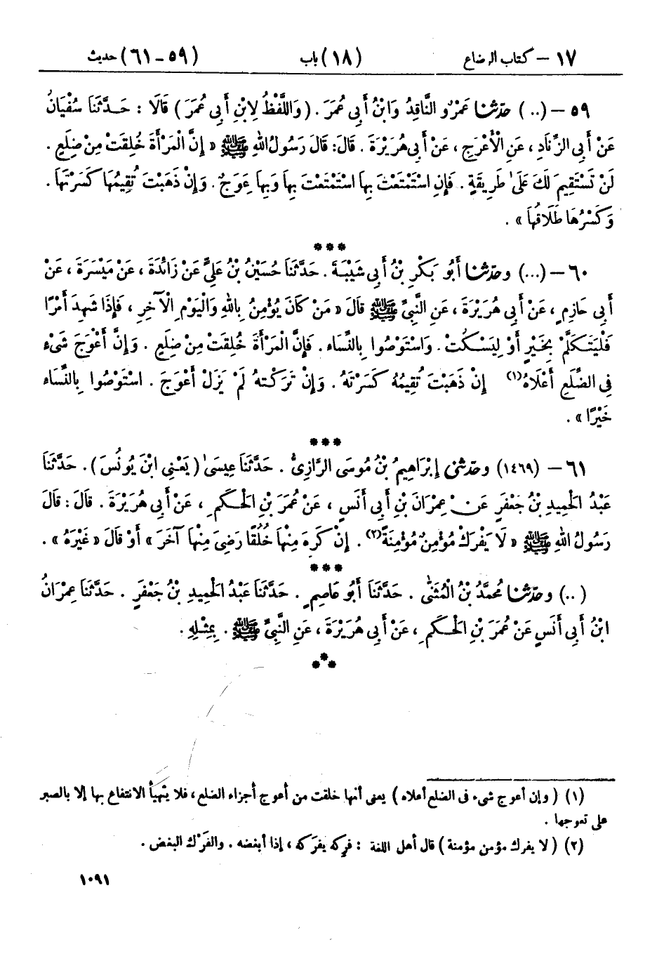 59 - (1468) حَدَّثَنَا عَمْرٌو النَّاقِدُ، وَابْنُ أَبِي عُمَرَ، وَاللَّفْظُ لِابْنِ أَبِي عُمَرَ، قَالَا: حَدَّثَنَا سُفْيَانُ، عَنْ أَبِي الزِّنَادِ، عَنِ الْأَعْرَجِ، عَنْ أَبِي هُرَيْرَةَ، قَالَ: قَالَ رَسُولُ اللهِ صَلَّى اللهُ عَلَيْهِ وَسَلَّمَ: «إِنَّ §الْمَرْأَةَ خُلِقَتْ مِنْ ضِلَعٍ لَنْ تَسْتَقِيمَ لَكَ عَلَى طَرِيقَةٍ، فَإِنِ اسْتَمْتَعْتَ بِهَا اسْتَمْتَعْتَ بِهَا وَبِهَا عِوَجٌ، وَإِنْ ذَهَبْتَ تُقِيمُهَا، كَسَرْتَهَا وَكَسْرُهَا طَلَاقُهَا»
