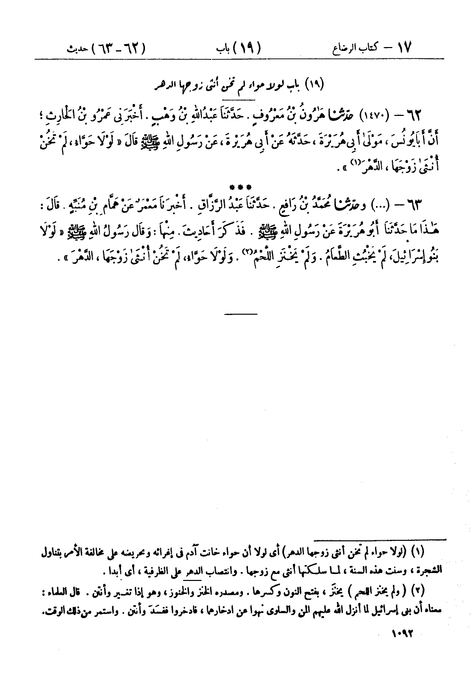 62 - (1470) حَدَّثَنَا هَارُونُ بْنُ مَعْرُوفٍ، حَدَّثَنَا عَبْدُ اللهِ بْنُ وَهْبٍ، أَخْبَرَنِي عَمْرُو بْنُ الْحَارِثِ، أَنَّ أَبَا يُونُسَ، مَوْلَى أَبِي هُرَيْرَةَ، حَدَّثَهُ عَنْ أَبِي هُرَيْرَةَ، عَنْ رَسُولِ اللهِ صَلَّى اللهُ عَلَيْهِ وَسَلَّمَ قَالَ: «§لَوْلَا حَوَّاءُ، لَمْ تَخُنْ أُنْثَى زَوْجَهَا الدَّهْرَ»