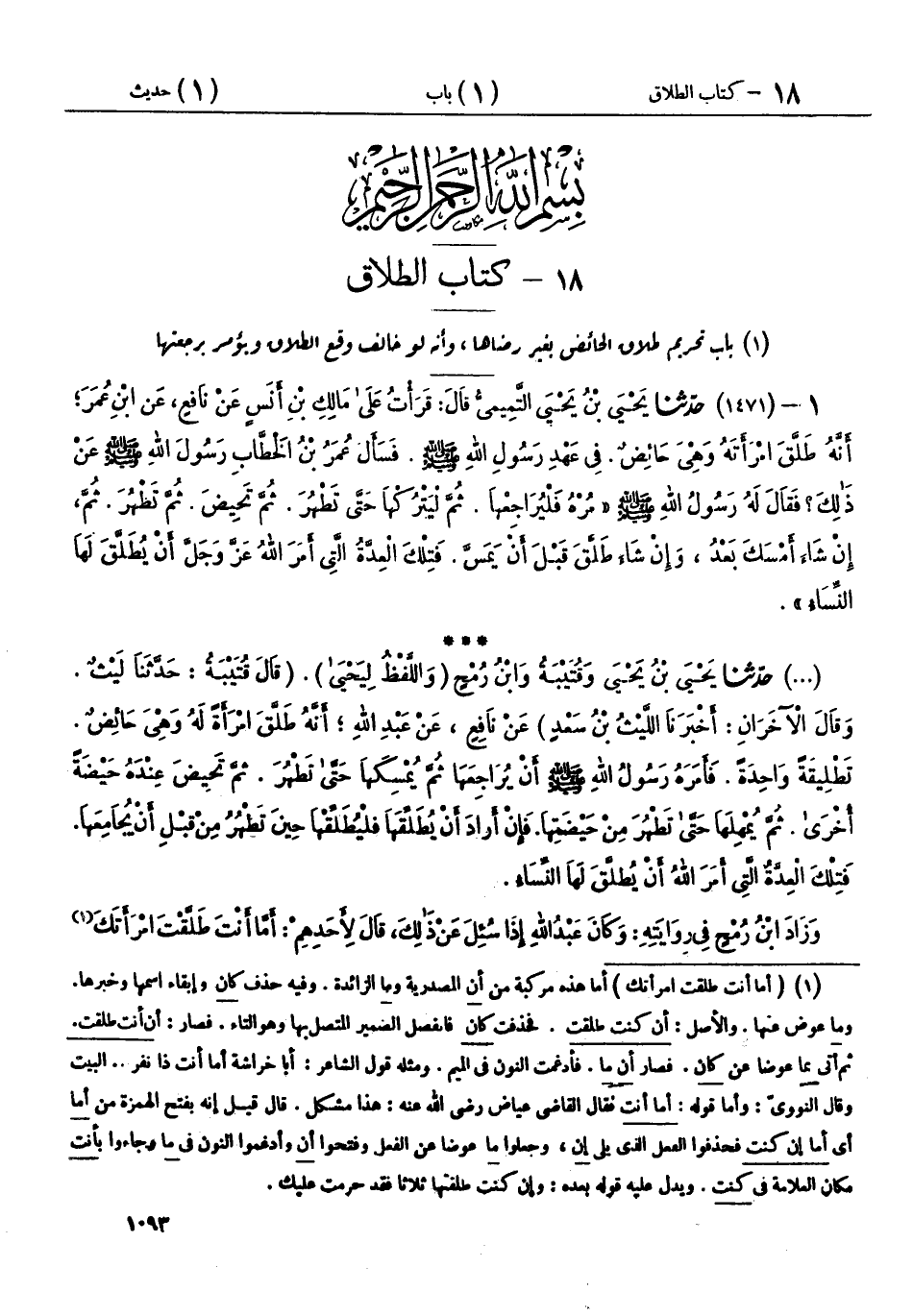 1 - (1471) حَدَّثَنَا يَحْيَى بْنُ يَحْيَى التَّمِيمِيُّ، قَالَ: قَرَأْتُ عَلَى مَالِكِ بْنِ أَنَسٍ، عَنْ نَافِعٍ، عَنِ ابْنِ عُمَرَ، أَنَّهُ طَلَّقَ امْرَأَتَهُ، وَهِيَ حَائِضٌ فِي عَهْدِ رَسُولِ اللهِ صَلَّى اللهُ عَلَيْهِ وَسَلَّمَ، فَسَأَلَ عُمَرُ بْنُ الْخَطَّابِ رَسُولَ اللهِ صَلَّى اللهُ عَلَيْهِ وَسَلَّمَ عَنْ ذَلِكَ، فَقَالَ لَهُ رَسُولُ اللهِ صَلَّى اللهُ عَلَيْهِ وَسَلَّمَ: «§مُرْهُ فَلْيُرَاجِعْهَا، ثُمَّ لِيَتْرُكْهَا حَتَّى تَطْهُرَ، ثُمَّ تَحِيضَ، ثُمَّ تَطْهُرَ، ثُمَّ إِنْ شَاءَ أَمْسَكَ بَعْدُ، وَإِنْ شَاءَ طَلَّقَ قَبْلَ أَنْ يَمَسَّ، فَتِلْكَ الْعِدَّةُ الَّتِي أَمَرَ اللهُ عَزَّ وَجَلَّ أَنْ يُطَلَّقَ لَهَا النِّسَاءُ»