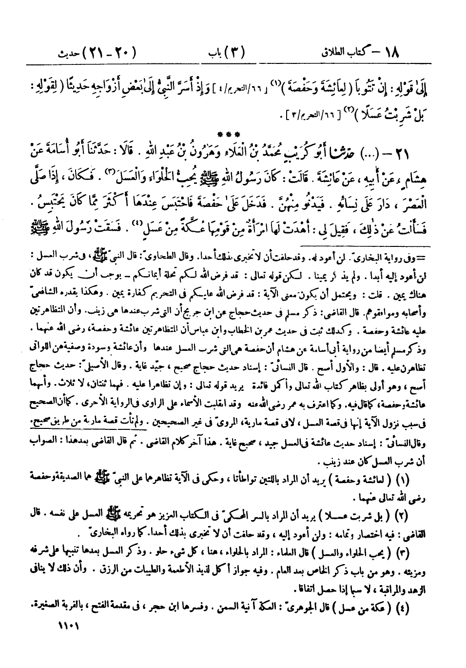 21 - (1474) حَدَّثَنَا أَبُو كُرَيْبٍ مُحَمَّدُ بْنُ الْعَلَاءِ، وَهَارُونُ بْنُ عَبْدِ اللهِ قَالَا: حَدَّثَنَا أَبُو أُسَامَةَ، عَنْ هِشَامٍ، عَنْ أَبِيهِ، عَنْ عَائِشَةَ، قَالَتْ: كَانَ رَسُولُ اللهِ صَلَّى اللهُ عَلَيْهِ وَسَلَّمَ §يُحِبُّ الْحَلْوَاءَ وَالْعَسَلَ، فَكَانَ إِذَا صَلَّى الْعَصْرَ دَارَ عَلَى نِسَائِهِ، فَيَدْنُو مِنْهُنَّ، فَدَخَلَ عَلَى حَفْصَةَ، فَاحْتَبَسَ عِنْدَهَا أَكْثَرَ مِمَّا كَانَ يَحْتَبِسُ، فَسَأَلْتُ عَنْ ذَلِكَ، فَقِيلَ لِي: أَهْدَتْ لَهَا امْرَأَةٌ مِنْ قَوْمِهَا عُكَّةً مِنْ عَسَلٍ، فَسَقَتْ رَسُولَ اللهِ صَلَّى اللهُ عَلَيْهِ وَسَلَّمَ مِنْهُ شَرْبَةً، فَقُلْتُ: أَمَا وَاللهِ لَنَحْتَالَنَّ لَهُ، فَذَكَرْتُ ذَلِكَ لِسَوْدَةَ، وَقُلْتُ: إِذَا دَخَلَ عَلَيْكِ، فَإِنَّهُ سَيَدْنُو مِنْكِ، فَقُولِي لَهُ: يَا رَسُولَ اللهِ، أَكَلْتَ مَغَافِيرَ؟ فَإِنَّهُ سَيَقُولُ لَكِ: «لَا»، فَقُولِي لَهُ: مَا هَذِهِ الرِّيحُ؟ وَكَانَ رَسُولُ اللهِ صَلَّى اللهُ عَلَيْهِ وَسَلَّمَ يَشْتَدُّ عَلَيْهِ أَنْ يُوجَدَ مِنْهُ الرِّيحُ، فَإِنَّهُ سَيَقُولُ لَكِ: «سَقَتْنِي حَفْصَةُ شَرْبَةَ عَسَلٍ»، فَقُولِي لَهُ: جَرَسَتْ نَحْلُهُ الْعُرْفُطَ، وَسَأَقُولُ ذَلِكِ لَهُ، وَقُولِيهِ أَنْتِ يَا صَفِيَّةُ، فَلَمَّا دَخَلَ عَلَى سَوْدَةَ قَالَتْ: تَقُولُ سَوْدَةُ: وَالَّذِي لَا إِلَهَ إِلَّا هُوَ لَقَدْ كِدْتُ أَنْ أُبَادِئَهُ بِالَّذِي قُلْتِ لِي، وَإِنَّهُ لَعَلَى الْبَابِ فَرَقًا مِنْكِ، فَلَمَّا دَنَا رَسُولُ اللهِ صَلَّى اللهُ عَلَيْهِ وَسَلَّمَ، قَالَتْ: يَا رَسُولَ اللهِ، أَكَلْتَ مَغَافِيرَ؟ قَالَ: «لَا»، قَالَتْ: فَمَا هَذِهِ الرِّيحُ؟ قَالَ: «سَقَتْنِي حَفْصَةُ شَرْبَةَ عَسَلٍ»، قَالَتْ: جَرَسَتْ نَحْلُهُ الْعُرْفُطَ، فَلَمَّا دَخَلَ عَلَيَّ، قُلْتُ لَهُ: مِثْلَ ذَلِكَ، ثُمَّ دَخَلَ عَلَى صَفِيَّةَ، فَقَالَتْ بِمِثْلِ ذَلِكَ، فَلَمَّا دَخَلَ عَلَى حَفْصَةَ، قَالَتْ: يَا رَسُولَ اللهِ، أَلَا أَسْقِيكَ مِنْهُ؟ قَالَ: «لَا حَاجَةَ لِي بِهِ»، قَالَتْ: تَقُولُ سَوْدَةُ: سُبْحَانَ اللهِ، وَاللهِ لَقَدْ حَرَمْنَاهُ، قَالَتْ: قُلْتُ لَهَا: اسْكُتِي