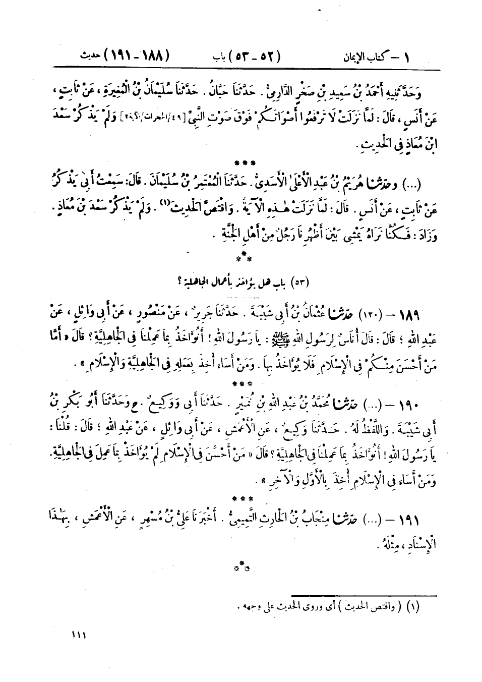 189 - (120) حَدَّثَنَا عُثْمَانُ بْنُ أَبِي شَيْبَةَ، حَدَّثَنَا جَرِيرٌ، عَنْ مَنْصُورٍ، عَنْ أَبِي وَائِلٍ، عَنْ عَبْدِ اللهِ، قَالَ: قَالَ أُنَاسٌ لِرَسُولِ اللهِ صَلَّى اللهُ عَلَيْهِ وَسَلَّمَ: يَا رَسُولَ اللهِ، أَنُؤَاخَذُ بِمَا عَمِلْنَا فِي الْجَاهِلِيَّةِ؟ قَالَ: «§أَمَّا مَنْ أَحْسَنَ مِنْكُمْ فِي الْإِسْلَامِ، فَلَا يُؤَاخَذُ بِهَا، وَمَنْ أَسَاءَ، أُخِذَ بِعَمَلِهِ فِي الْجَاهِلِيَّةِ وَالْإِسْلَامِ»