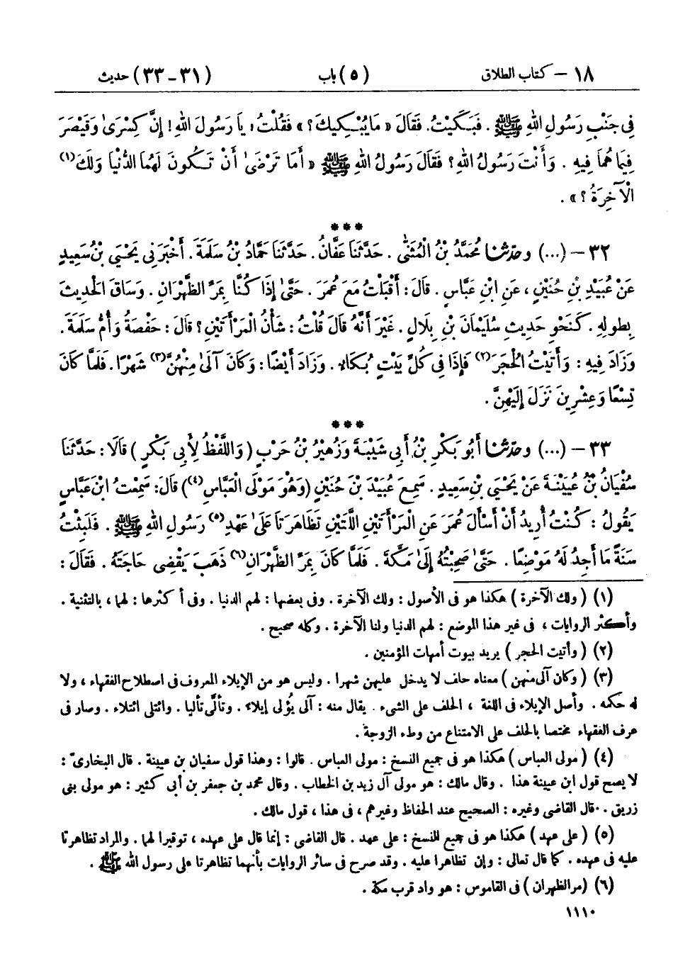 32 - (1479) وحَدَّثَنَا مُحَمَّدُ بْنُ الْمُثَنَّى، حَدَّثَنَا عَفَّانُ، حَدَّثَنَا حَمَّادُ بْنُ سَلَمَةَ، أَخْبَرَنِي يَحْيَى بْنُ سَعِيدٍ، عَنْ عُبَيْدِ بْنِ حُنَيْنٍ، عَنِ ابْنِ عَبَّاسٍ، قَالَ: أَقْبَلْتُ مَعَ عُمَرَ حَتَّى إِذَا كُنَّا بِمَرِّ الظَّهْرَانِ، وَسَاقَ الْحَدِيثَ بِطُولِهِ كَنَحْوِ حَدِيثِ سُلَيْمَانَ بْنِ بِلَالٍ، غَيْرَ أَنَّهُ قَالَ: قُلْتُ: شَأْنُ الْمَرْأَتَيْنِ؟ قَالَ: حَفْصَةُ، وَأُمُّ سَلَمَةَ، وَزَادَ فِيهِ: وَأَتَيْتُ الْحُجَرَ، فَإِذَا فِي كُلِّ بَيْتٍ بُكَاءٌ، وَزَادَ أَيْضًا: وَكَانَ آلَى مِنْهُنَّ شَهْرًا، فَلَمَّا كَانَ تِسْعًا وَعِشْرِينَ نَزَلَ إِلَيْهِنَّ