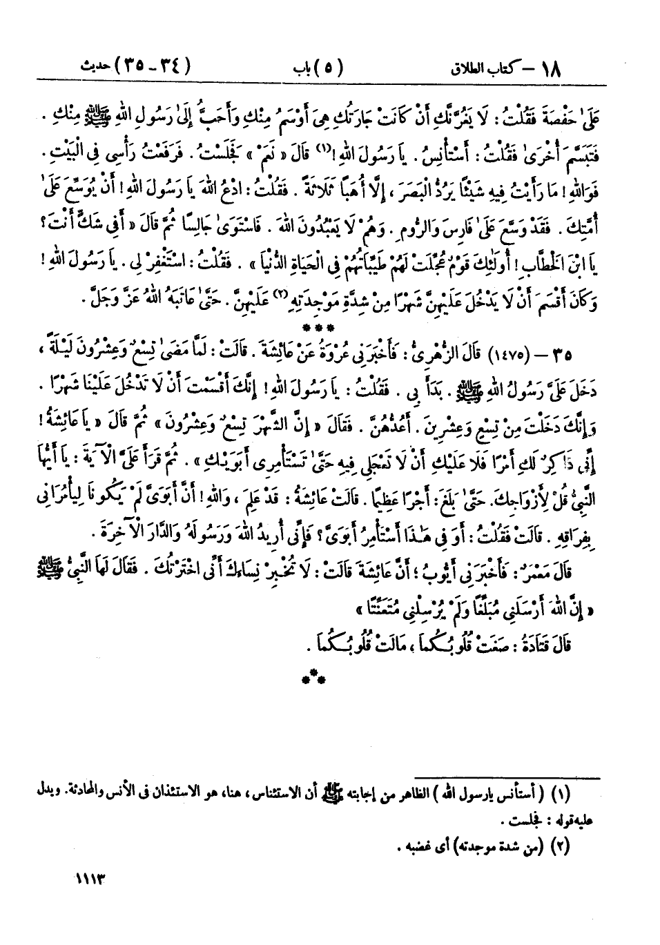 35 - (1475) قَالَ الزُّهْرِيُّ: فَأَخْبَرَنِي عُرْوَةُ، عَنْ عَائِشَةَ، قَالَتْ: لَمَّا مَضَى تِسْعٌ وَعِشْرُونَ لَيْلَةً دَخَلَ عَلَيَّ رَسُولُ اللهِ صَلَّى اللهُ عَلَيْهِ وَسَلَّمَ، بَدَأَ بِي، فَقُلْتُ: يَا رَسُولَ اللهِ، إِنَّكَ أَقْسَمْتَ أَنْ لَا تَدْخُلَ عَلَيْنَا شَهْرًا، وَإِنَّكَ دَخَلْتَ مِنْ تِسْعٍ وَعِشْرِينَ أَعُدُّهُنَّ، فَقَالَ: «إِنَّ §الشَّهْرَ تِسْعٌ وَعِشْرُونَ»، ثُمَّ قَالَ: «يَا عَائِشَةُ، إِنِّي ذَاكِرٌ لَكِ أَمْرًا، فَلَا عَلَيْكِ أَنْ لَا تَعْجَلِي فِيهِ حَتَّى تَسْتَأْمِرِي أَبَوَيْكِ»، ثُمَّ قَرَأَ عَلَيَّ الْآيَةَ {يَا أَيُّهَا النَّبِيُّ قُلْ لِأَزْوَاجِكَ} [الأحزاب: 28] حَتَّى بَلَغَ {أَجْرًا عَظِيمًا} [النساء: 40]، قَالَتْ عَائِشَةُ: قَدْ عَلِمَ وَاللهِ أَنَّ أَبَوَيَّ لَمْ يَكُونَا لِيَأْمُرَانِي بِفِرَاقِهِ، قَالَتْ: فَقُلْتُ: أَوَفِي هَذَا أَسْتَأْمِرُ أَبَوَيَّ؟ فَإِنِّي أُرِيدُ اللهَ وَرَسُولَهُ وَالدَّارَ الْآخِرَةَ، قَالَ مَعْمَرٌ، فَأَخْبَرَنِي أَيُّوبُ، أَنَّ عَائِشَةَ، قَالَتْ: لَا تُخْبِرْ نِسَاءَكَ أَنِّي اخْتَرْتُكَ، فَقَالَ لَهَا النَّبِيُّ صَلَّى اللهُ عَلَيْهِ وَسَلَّمَ: «إِنَّ اللهَ أَرْسَلَنِي مُبَلِّغًا، وَلَمْ يُرْسِلْنِي مُتَعَنِّتًا»، قَالَ قَتَادَةُ: «صَغَتْ قُلُوبُكُمَا، مَالَتْ قُلُوبُكُمَا»