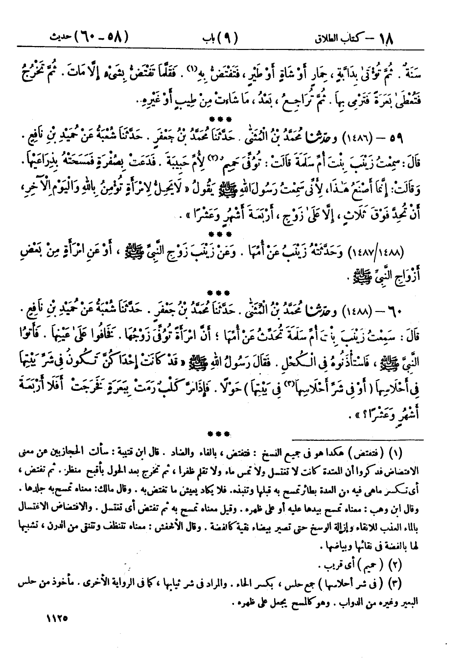 60 - (1488) وحَدَّثَنَا مُحَمَّدُ بْنُ الْمُثَنَّى، حَدَّثَنَا مُحَمَّدُ بْنُ جَعْفَرٍ، حَدَّثَنَا شُعْبَةُ، عَنْ حُمَيْدِ بْنِ نَافِعٍ، قَالَ: سَمِعْتُ زَيْنَبَ بِنْتَ أُمِّ سَلَمَةَ، تُحَدِّثُ عَنْ أُمِّهَا، أَنَّ امْرَأَةً تُوُفِّيَ زَوْجُهَا، فَخَافُوا عَلَى عَيْنِهَا، فَأَتَوُا النَّبِيَّ صَلَّى اللهُ عَلَيْهِ وَسَلَّمَ، فَاسْتَأْذَنُوهُ فِي الْكُحْلِ، فَقَالَ رَسُولُ اللهِ صَلَّى اللهُ عَلَيْهِ وَسَلَّمَ: «قَدْ §كَانَتْ إِحْدَاكُنَّ تَكُونُ فِي شَرِّ بَيْتِهَا فِي أَحْلَاسِهَا - أَوْ فِي شَرِّ أَحْلَاسِهَا - فِي بَيْتِهَا حَوْلًا، فَإِذَا مَرَّ كَلْبٌ رَمَتْ بِبَعْرَةٍ، فَخَرَجَتْ، أَفَلَا أَرْبَعَةَ أَشْهُرٍ وَعَشْرًا؟»،