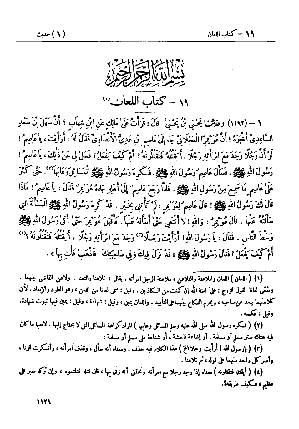 1 - (1492) وحَدَّثَنَا يَحْيَى بْنُ يَحْيَى، قَالَ: قَرَأْتُ عَلَى مَالِكٍ، عَنِ ابْنِ شِهَابٍ، أَنَّ سَهْلَ بْنَ سَعْدٍ السَّاعِدِيَّ، أَخْبَرَهُ، أَنَّ عُوَيْمِرًا الْعَجْلَانِيَّ، جَاءَ إِلَى عَاصِمِ بْنِ عَدِيٍّ الْأَنْصَارِيِّ، فَقَالَ لَهُ: أَرَأَيْتَ يَا عَاصِمُ لَوْ أَنَّ رَجُلًا وَجَدَ مَعَ امْرَأَتِهِ رَجُلًا أَيَقْتُلُهُ، فَتَقْتُلُونَهُ، أَمْ كَيْفَ يَفْعَلُ؟ فَسَلْ لِي عَنْ ذَلِكَ يَا عَاصِمُ رَسُولَ اللهِ صَلَّى اللهُ عَلَيْهِ وَسَلَّمَ، فَسَأَلَ عَاصِمٌ رَسُولَ اللهِ صَلَّى اللهُ عَلَيْهِ وَسَلَّمَ، فَكَرِهَ رَسُولُ اللهِ صَلَّى اللهُ عَلَيْهِ وَسَلَّمَ الْمَسَائِلَ وَعَابَهَا، حَتَّى كَبُرَ عَلَى عَاصِمٍ مَا سَمِعَ مِنْ رَسُولِ اللهِ صَلَّى اللهُ عَلَيْهِ وَسَلَّمَ، فَلَمَّا رَجَعَ عَاصِمٌ إِلَى أَهْلِهِ جَاءَهُ عُوَيْمِرٌ، فَقَالَ: يَا عَاصِمُ مَاذَا قَالَ لَكَ رَسُولُ اللهِ صَلَّى اللهُ عَلَيْهِ وَسَلَّمَ؟ قَالَ عَاصِمٌ لِعُوَيْمِرٍ: لَمْ تَأْتِنِي بِخَيْرٍ، قَدْ كَرِهَ رَسُولُ اللهِ صَلَّى اللهُ عَلَيْهِ وَسَلَّمَ الْمَسْأَلَةَ الَّتِي سَأَلْتُهُ عَنْهَا؟ قَالَ عُوَيْمِرٌ: وَاللهِ، لَا أَنْتَهِي حَتَّى أَسْأَلَهُ عَنْهَا، فَأَقْبَلَ عُوَيْمِرٌ حَتَّى أَتَى رَسُولَ اللهِ صَلَّى اللهُ عَلَيْهِ وَسَلَّمَ وَسَطَ النَّاسِ، فَقَالَ: يَا رَسُولَ اللهِ، أَرَأَيْتَ رَجُلًا وَجَدَ مَعَ امْرَأَتِهِ رَجُلًا أَيَقْتُلُهُ فَتَقْتُلُونَهُ؟ أَمْ كَيْفَ يَفْعَلُ؟ فَقَالَ رَسُولُ اللهِ صَلَّى اللهُ عَلَيْهِ وَسَلَّمَ: «§قَدْ نَزَلَ فِيكَ وَفِي صَاحِبَتِكَ، فَاذْهَبْ فَأْتِ بِهَا»، قَالَ سَهْلٌ: فَتَلَاعَنَا وَأَنَا مَعَ النَّاسِ عِنْدَ رَسُولِ اللهِ صَلَّى اللهُ عَلَيْهِ وَسَلَّمَ، فَلَمَّا فَرَغَا، قَالَ عُوَيْمِرٌ: كَذَبْتُ عَلَيْهَا يَا رَسُولَ اللهِ، إِنْ أَمْسَكْتُهَا، فَطَلَّقَهَا ثَلَاثًا قَبْلَ أَنْ يَأْمُرَهُ رَسُولُ اللهِ صَلَّى اللهُ عَلَيْهِ وَسَلَّمَ قَالَ ابْنُ شِهَابٍ: «فَكَانَتْ سُنَّةَ الْمُتَلَاعِنَيْنِ»،