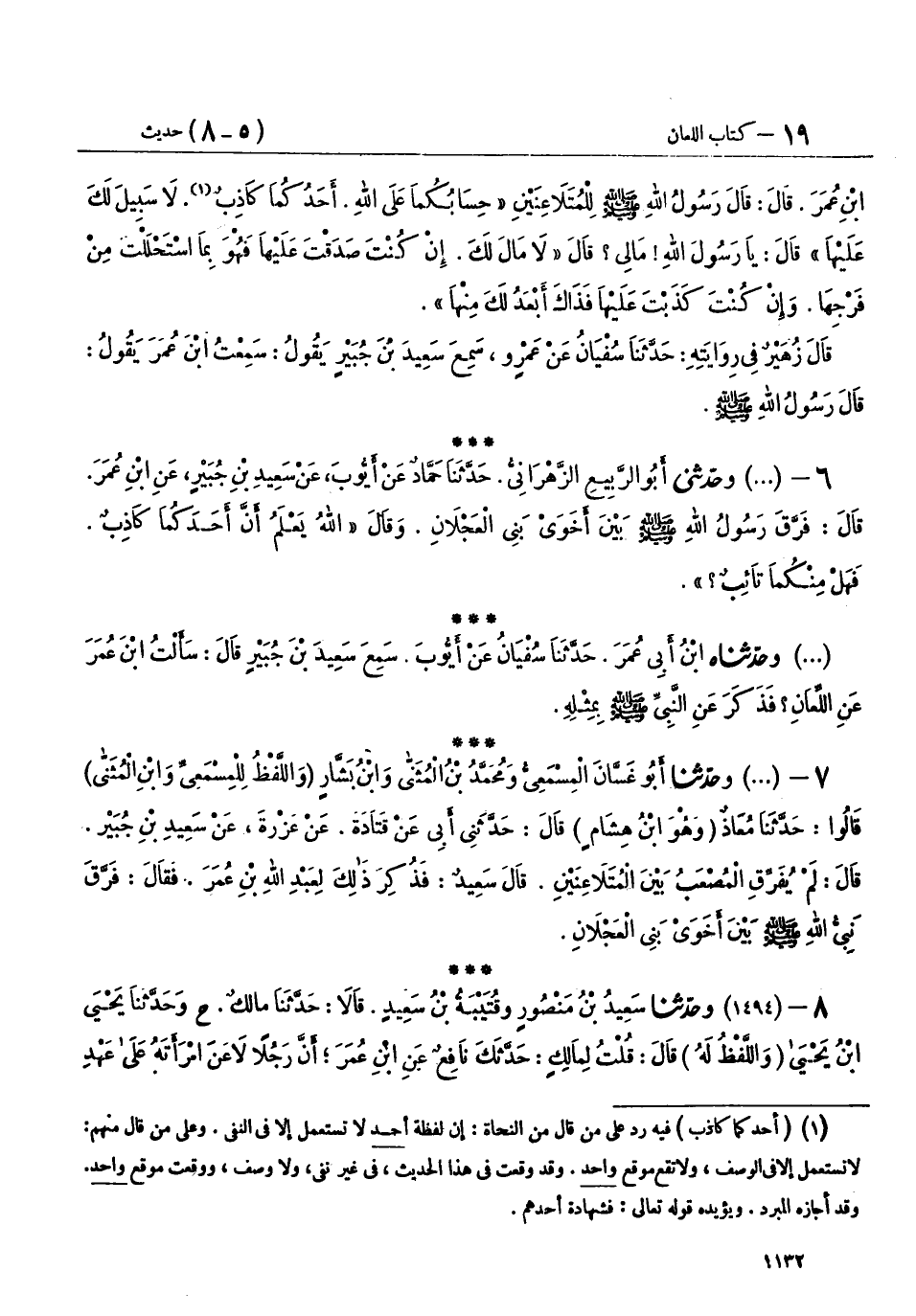 6 - (1493) وحَدَّثَنِي أَبُو الرَّبِيعِ الزَّهْرَانِيُّ، حَدَّثَنَا حَمَّادٌ، عَنْ أَيُّوبَ، عَنْ سَعِيدِ بْنِ جُبَيْرٍ، عَنِ ابْنِ عُمَرَ، قَالَ: فَرَّقَ رَسُولُ اللهِ صَلَّى اللهُ عَلَيْهِ وَسَلَّمَ بَيْنَ أَخَوَيْ بَنِي الْعَجْلَانِ، وَقَالَ: «§اللهُ يَعْلَمُ أَنَّ أَحَدَكُمَا كَاذِبٌ، فَهَلْ مِنْكُمَا تَائِبٌ»؟،