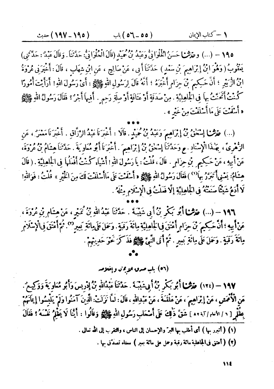 196 - (123) حَدَّثَنَا أَبُو بَكْرِ بْنُ أَبِي شَيْبَةَ، حَدَّثَنَا عَبْدُ اللهِ بْنُ نُمَيْرٍ، عَنْ هِشَامِ بْنِ عُرْوَةَ، عَنْ أَبِيهِ، أَنَّ حَكِيمَ بْنَ حِزَامٍ، أَعْتَقَ فِي الْجَاهِلِيَّةِ مِائَةَ رَقَبَةٍ، وَحَمَلَ عَلَى مِائَةِ بَعِيرٍ، ثُمَّ أَعْتَقَ فِي الْإِسْلَامِ مِائَةَ رَقَبَةٍ وَحَمَلَ عَلَى مِائَةِ بَعِيرٍ، ثُمَّ أَتَى النَّبِيَّ صَلَّى اللهُ عَلَيْهِ وَسَلَّمَ، فَذَكَرَ نَحْوَ حَدِيثِهِمْ