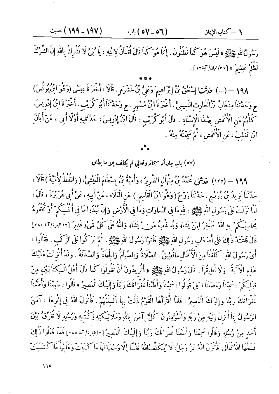 199 - (125) حَدَّثَنِي مُحَمَّدُ بْنُ مِنْهَالٍ الضَّرِيرُ، وَأُمَيَّةُ بْنُ بِسْطَامَ الْعَيْشِيُّ، وَاللَّفْظُ لِأُمَيَّةَ، قَالَا: حَدَّثَنَا يَزِيدُ بْنُ زُرَيْعٍ، حَدَّثَنَا رَوْحٌ وَهُوَ ابْنُ الْقَاسِمِ، عَنِ الْعَلَاءِ، عَنْ أَبِيهِ، عَنْ أَبِي هُرَيْرَةَ قَالَ: لَمَّا نَزَلَتْ عَلَى رَسُولِ اللهِ صَلَّى اللهُ عَلَيْهِ وَسَلَّمَ {لِلَّهِ مَا فِي السَّمَاوَاتِ وَمَا فِي الْأَرْضِ وَإِنْ تُبْدُوا مَا فِي أَنْفُسِكُمْ أَوْ تُخْفُوهُ يُحَاسِبْكُمْ بِهِ اللهُ فَيَغْفِرُ لِمَنْ يَشَاءُ وَيُعَذِّبُ مَنْ يَشَاءُ وَاللهُ عَلَى كُلِّ شَيْءٍ قَدِيرٌ} [البقرة: 284]، قَالَ: فَاشْتَدَّ ذَلِكَ عَلَى أَصْحَابِ رَسُولِ اللهِ صَلَّى اللهُ عَلَيْهِ وَسَلَّمَ، فَأَتَوْا رَسُولَ اللهِ صَلَّى اللهُ عَلَيْهِ وَسَلَّمَ ثُمَّ بَرَكُوا عَلَى الرُّكَبِ، فَقَالُوا: أَيْ رَسُولَ اللهِ، كُلِّفْنَا مِنَ الْأَعْمَالِ مَا نُطِيقُ، الصَّلَاةَ وَالصِّيَامَ وَالْجِهَادَ وَالصَّدَقَةَ، وَقَدِ اُنْزِلَتْ عَلَيْكَ هَذِهِ الْآيَةُ وَلَا نُطِيقُهَا، قَالَ رَسُولُ اللهِ صَلَّى اللهُ عَلَيْهِ وَسَلَّمَ: " §أَتُرِيدُونَ أَنْ تَقُولُوا كَمَا قَالَ أَهْلُ الْكِتَابَيْنِ مِنْ قَبْلِكُمْ سَمِعْنَا وَعَصَيْنَا؟ بَلْ قُولُوا: سَمِعْنَا وَأَطَعْنَا غُفْرَانَكَ رَبَّنَا وَإِلَيْكَ الْمَصِيرُ "، قَالُوا: سَمِعْنَا وَأَطَعْنَا غُفْرَانَكَ رَبَّنَا وَإِلَيْكَ الْمَصِيرُ، فَلَمَّا اقْتَرَأَهَا الْقَوْمُ، ذَلَّتْ بِهَا أَلْسِنَتُهُمْ، فَأَنْزَلَ اللهُ فِي إِثْرِهَا: {آمَنَ الرَّسُولُ بِمَا أُنْزِلَ إِلَيْهِ مِنْ رَبِّهِ وَالْمُؤْمِنُونَ كُلٌّ آمَنَ بِاللهِ وَمَلَائِكَتِهِ وَكُتُبِهِ وَرُسُلِهِ لَا نُفَرِّقُ بَيْنَ أَحَدٍ مِنْ رُسُلِهِ وَقَالُوا سَمِعْنَا وَأَطَعْنَا غُفْرَانَكَ رَبَّنَا وَإِلَيْكَ الْمَصِيرُ} [البقرة: 285]، فَلَمَّا فَعَلُوا ذَلِكَ نَسَخَهَا اللهُ تَعَالَى، فَأَنْزَلَ اللهُ عَزَّ وَجَلَّ: {لَا يُكَلِّفُ اللهُ نَفْسًا إِلَّا وُسْعَهَا لَهَا مَا كَسَبَتْ وَعَلَيْهَا مَا اكْتَسَبَتْ رَبَّنَا لَا تُؤَاخِذْنَا إِنْ نَسِينَا أَوْ أَخْطَأْنَا} [البقرة: 286] " قَالَ: نَعَمْ " {رَبَّنَا وَلَا تَحْمِلْ عَلَيْنَا إِصْرًا كَمَا حَمَلْتَهُ عَلَى الَّذِينَ مِنْ قَبْلِنَا} [البقرة: 286] " قَالَ: نَعَمْ " {رَبَّنَا وَلَا تُحَمِّلْنَا مَا لَا طَاقَةَ لَنَا بِهِ} [البقرة: 286] " قَالَ: نَعَمْ " {وَاعْفُ عَنَّا وَاغْفِرْ لَنَا وَارْحَمْنَا أَنْتَ مَوْلَانَا فَانْصُرْنَا عَلَى الْقَوْمِ الْكَافِرِينَ} [البقرة: 286] " قَالَ: نَعَمْ "