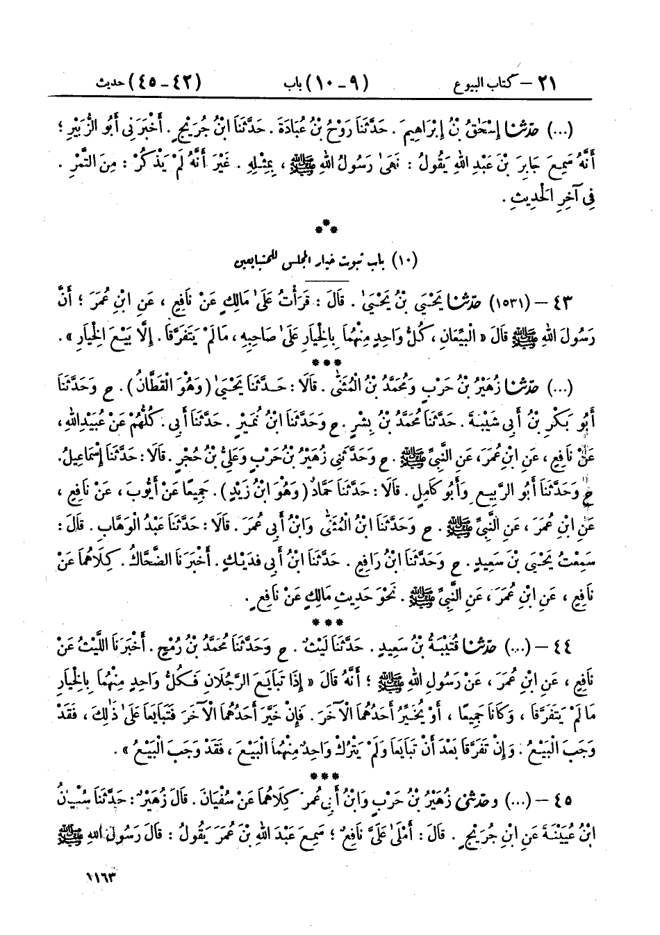 45 - (1531) وحَدَّثَنِي زُهَيْرُ بْنُ حَرْبٍ، وَابْنُ أَبِي عُمَرَ، كِلَاهُمَا عَنْ سُفْيَانَ، قَالَ زُهَيْرٌ: حَدَّثَنَا سُفْيَانُ بْنُ عُيَيْنَةَ، عَنِ ابْنِ جُرَيْجٍ، قَالَ: أَمْلَى عَلَيَّ نَافِعٌ، سَمِعَ عَبْدَ اللهِ بْنَ عُمَرَ، يَقُولُ: قَالَ رَسُولُ اللهِ صَلَّى اللهُ عَلَيْهِ وَسَلَّمَ: «§إِذَا تَبَايَعَ الْمُتَبَايِعَانِ بِالْبَيْعِ فَكُلُّ وَاحِدٍ مِنْهُمَا بِالْخِيَارِ مِنْ بَيْعِهِ مَا لَمْ يَتَفَرَّقَا، أَوْ يَكُونُ بَيْعُهُمَا عَنْ خِيَارٍ، فَإِذَا كَانَ بَيْعُهُمَا عَنْ خِيَارٍ، فَقَدْ وَجَبَ»، زَادَ ابْنُ أَبِي عُمَرَ فِي رِوَايَتِهِ: قَالَ نَافِعٌ: فَكَانَ إِذَا بَايَعَ رَجُلًا، فَأَرَادَ أَنْ لَا يُقِيلَهُ، قَامَ فَمَشَى هُنَيَّةً، ثُمَّ رَجَعَ إِلَيْهِ