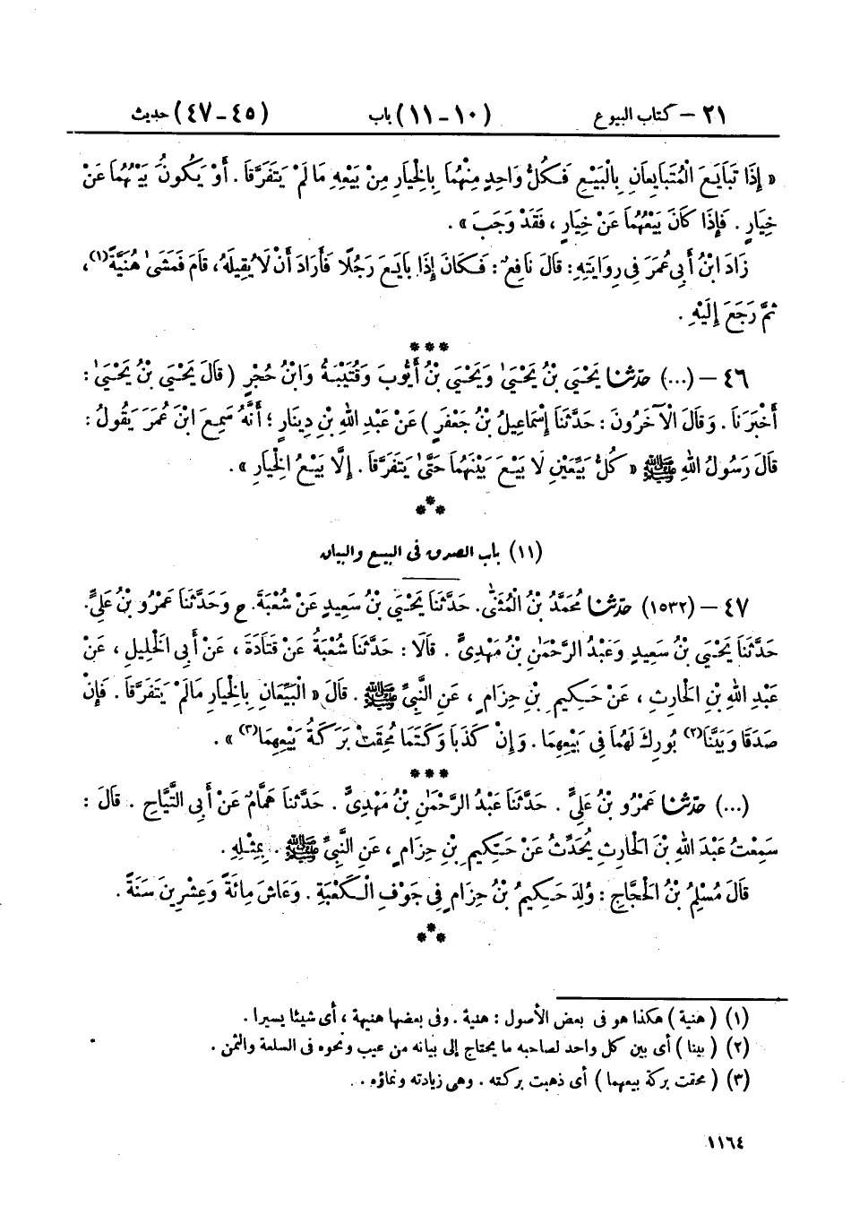 46 - (1531) حَدَّثَنَا يَحْيَى بْنُ يَحْيَى، وَيَحْيَى بْنُ أَيُّوبَ، وَقُتَيْبَةُ، وَابْنُ حُجْرٍ، قَالَ يَحْيَى بْنُ يَحْيَى: أَخْبَرَنَا، وقَالَ الْآخَرُونَ: حَدَّثَنَا إِسْمَاعِيلُ بْنُ جَعْفَرٍ، عَنْ عَبْدِ اللهِ بْنِ دِينَارٍ، أَنَّهُ سَمِعَ ابْنَ عُمَرَ، يَقُولُ: قَالَ رَسُولُ اللهِ صَلَّى اللهُ عَلَيْهِ وَسَلَّمَ «§كُلُّ بَيِّعَيْنِ لَا بَيْعَ بَيْنَهُمَا حَتَّى يَتَفَرَّقَا، إِلَّا بَيْعُ الْخِيَارِ»