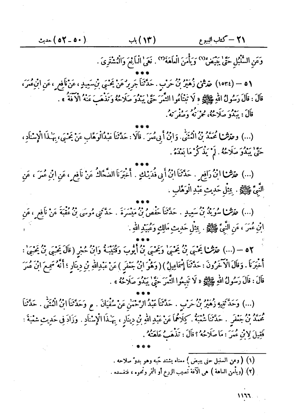 51 - (1534) حَدَّثَنِي زُهَيْرُ بْنُ حَرْبٍ، حَدَّثَنَا جَرِيرٌ، عَنْ يَحْيَى بْنِ سَعِيدٍ، عَنْ نَافِعٍ، عَنِ ابْنِ عُمَرَ، قَالَ: قَالَ رَسُولُ اللهِ صَلَّى اللهُ عَلَيْهِ وَسَلَّمَ: «§لَا تَبْتَاعُوا الثَّمَرَ حَتَّى يَبْدُوَ صَلَاحُهُ، وَتَذْهَبَ عَنْهُ الْآفَةُ»، قَالَ: " يَبْدُوَ صَلَاحُهُ: حُمْرَتُهُ وَصُفْرَتُهُ "،
