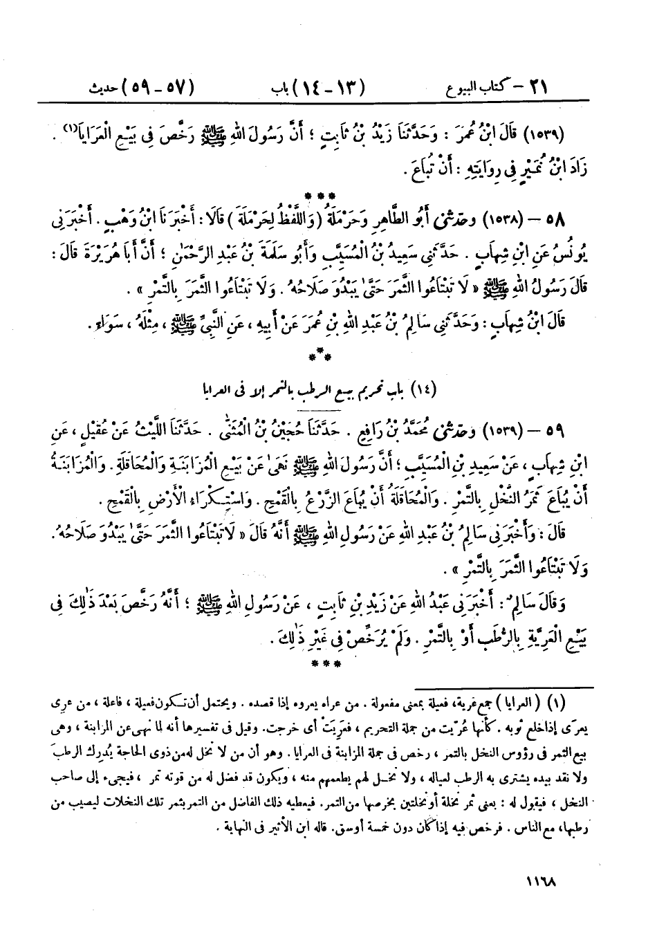 59 - (1539) وحَدَّثَنِي مُحَمَّدُ بْنُ رَافِعٍ، حَدَّثَنَا حُجَيْنُ بْنُ الْمُثَنَّى، حَدَّثَنَا اللَّيْثُ، عَنْ عُقَيْلٍ، عَنِ ابْنِ شِهَابٍ، عَنْ سَعِيدِ بْنِ الْمُسَيِّبِ، «أَنَّ رَسُولَ اللهِ صَلَّى اللهُ عَلَيْهِ وَسَلَّمَ §نَهَى عَنْ بَيْعِ الْمُزَابَنَةِ وَالْمُحَاقَلَةِ»، " وَالْمُزَابَنَةُ: أَنْ يُبَاعَ ثَمَرُ النَّخْلِ بِالتَّمْرِ، وَالْمُحَاقَلَةُ: أَنْ يُبَاعَ الزَّرْعُ بِالْقَمْحِ، وَاسْتِكْرَاءُ الْأَرْضِ بِالْقَمْحِ "