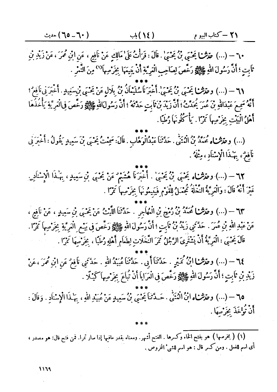 61 - (1539) وحَدَّثَنَا يَحْيَى بْنُ يَحْيَى، أَخْبَرَنَا سُلَيْمَانُ بْنُ بِلَالٍ، عَنْ يَحْيَى بْنِ سَعِيدٍ، أَخْبَرَنِي نَافِعٌ، أَنَّهُ سَمِعَ عَبْدَ اللهِ بْنَ عُمَرَ، يُحَدِّثُ أَنَّ زَيْدَ بْنَ ثَابِتٍ، حَدَّثَهُ، «أَنَّ رَسُولَ اللهِ صَلَّى اللهُ عَلَيْهِ وَسَلَّمَ §رَخَّصَ فِي الْعَرِيَّةِ يَأْخُذُهَا أَهْلُ الْبَيْتِ بِخَرْصِهَا تَمْرًا، يَأْكُلُونَهَا رُطَبًا»،