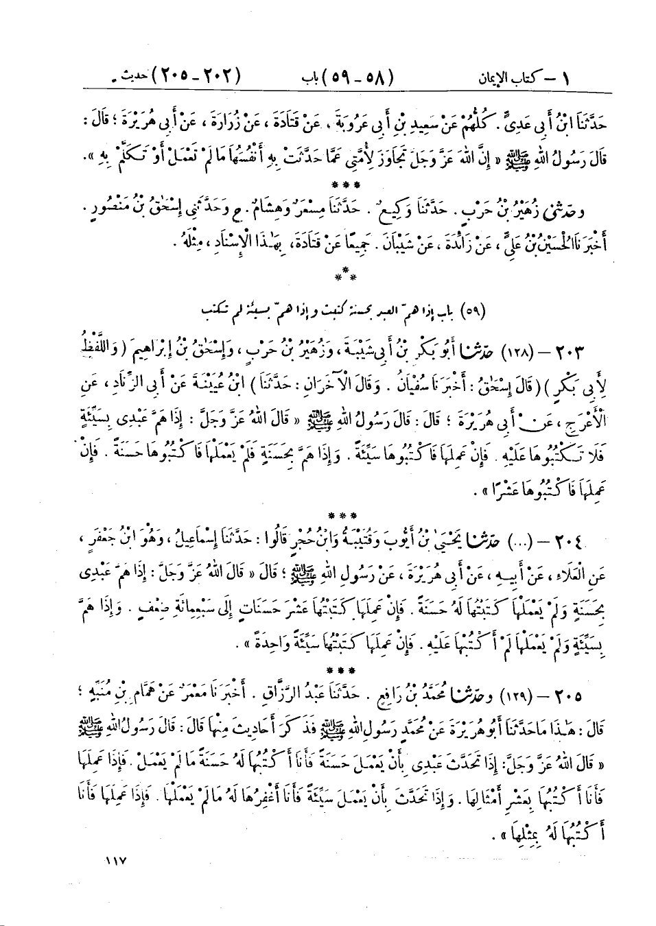 205 - (129) وَحَدَّثَنَا مُحَمَّدُ بْنُ رَافِعٍ، حَدَّثَنَا عَبْدُ الرَّزَّاقِ، أَخْبَرَنَا مَعْمَرٌ، عَنْ هَمَّامِ بْنِ مُنَبِّهٍ، قَالَ: هَذَا مَا حَدَّثَنَا أَبُو هُرَيْرَةَ، عَنْ مُحَمَّدٍ رَسُولِ اللهِ صَلَّى اللهُ عَلَيْهِ وَسَلَّمَ، فَذَكَرَ أَحَادِيثَ مِنْهَا قَالَ: قَالَ رَسُولُ اللهِ صَلَّى اللهُ عَلَيْهِ وَسَلَّمَ: " قَالَ اللهُ عَزَّ وَجَلَّ: §إِذَا تَحَدَّثَ عَبْدِي بِأَنْ يَعْمَلَ حَسَنَةً، فَأَنَا أَكْتُبُهَا لَهُ حَسَنَةً مَا لَمْ يَعْمَلْ، فَإِذَا عَمِلَهَا، فَأَنَا أَكْتُبُهَا بِعَشْرِ أَمْثَالِهَا، وَإِذَا تَحَدَّثَ بِأَنْ يَعْمَلَ سَيِّئَةً، فَأَنَا أَغْفِرُهَا لَهُ مَا لَمْ يَعْمَلْهَا، فَإِذَا عَمِلَهَا، فَأَنَا أَكْتُبُهَا لَهُ بِمِثْلِهَا " وَقَالَ رَسُولُ اللهِ صَلَّى اللهُ عَلَيْهِ وَسَلَّمَ: " قَالَتِ الْملَائِكَةُ: رَبِّ، ذَاكَ عَبْدُكَ يُرِيدُ أَنْ يَعْمَلَ سَيِّئَةً، وَهُوَ أَبْصَرُ بِهِ، فَقَالَ: ارْقُبُوهُ فَإِنْ عَمِلَهَا فَاكْتُبُوهَا لَهُ بِمِثْلِهَا، وَإِنْ تَرَكَهَا فَاكْتُبُوهَا لَهُ حَسَنَةً، إِنَّمَا تَرَكَهَا مِنْ جَرَّايَ " وَقَالَ رسولُ اللهِ صَلَّى اللهُ عَلَيْهِ وَسَلَّمَ: «إِذَا أَحْسَنَ أَحَدُكُمْ إِسْلَامَهُ، فَكُلُّ حَسَنَةٍ يَعْمَلُهَا تُكْتَبُ بِعَشْرِ أَمْثَالِهَا إِلَى سَبْعِ مِائَةِ ضِعْفٍ، وَكُلُّ سَيِّئَةٍ يَعْمَلُهَا تُكْتَبُ بِمِثْلِهَا حَتَّى يَلْقَى اللهَ»