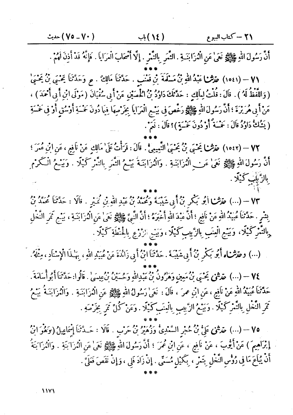 72 - (1542) حَدَّثَنَا يَحْيَى بْنُ يَحْيَى التَّمِيمِيُّ، قَالَ: قَرَأْتُ عَلَى مَالِكٍ، عَنْ نَافِعٍ، عَنِ ابْنِ عُمَرَ، «أَنَّ رَسُولَ اللهِ صَلَّى اللهُ عَلَيْهِ وَسَلَّمَ §نَهَى عَنِ الْمُزَابَنَةِ»، وَالْمُزَابَنَةُ: بَيْعُ الثَّمَرِ بِالتَّمْرِ كَيْلًا، وَبَيْعُ الْكَرْمِ بِالزَّبِيبِ كَيْلًا "