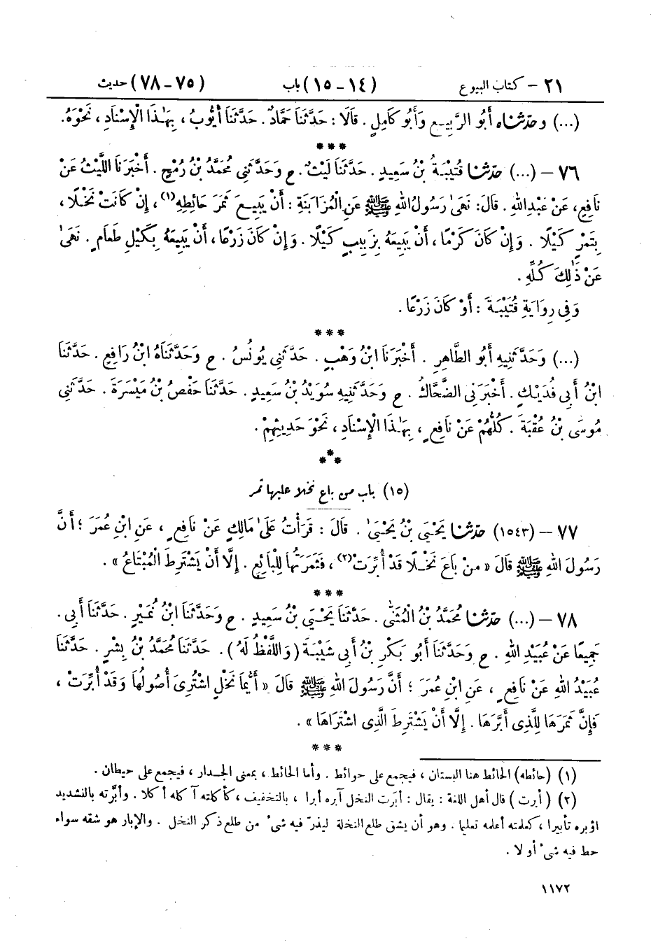77 - (1543) حَدَّثَنَا يَحْيَى بْنُ يَحْيَى، قَالَ: قَرَأْتُ عَلَى مَالِكٍ، عَنْ نَافِعٍ، عَنِ ابْنِ عُمَرَ، أَنَّ رَسُولَ اللهِ صَلَّى اللهُ عَلَيْهِ وَسَلَّمَ قَالَ: «§مَنْ بَاعَ نَخْلًا قَدْ أُبِّرَتْ، فَثَمَرَتُهَا لِلْبَائِعِ، إِلَّا أَنْ يَشْتَرِطَ الْمُبْتَاعُ»
