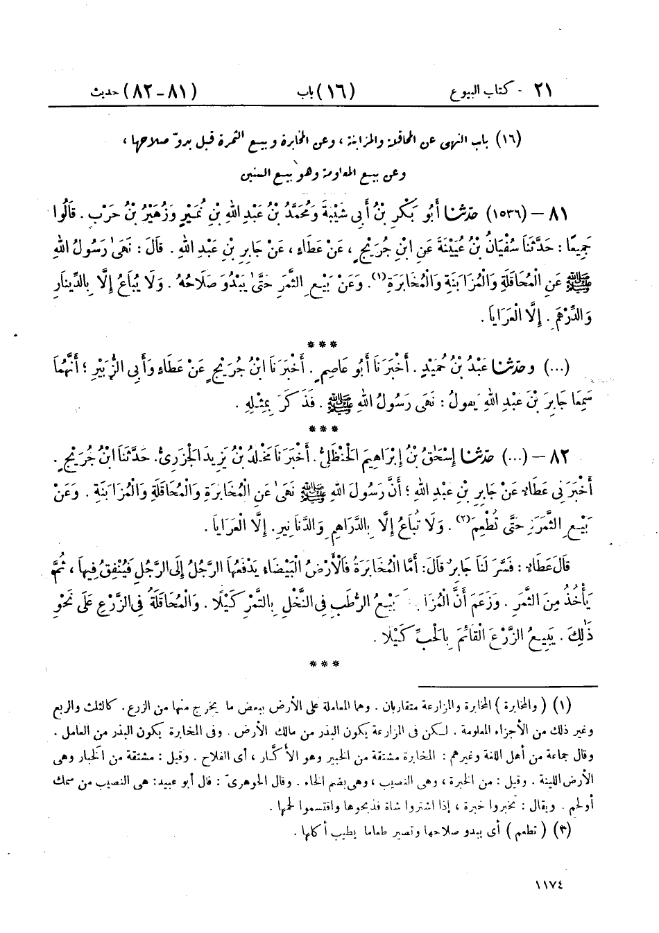 81 - (1536) حَدَّثَنَا أَبُو بَكْرِ بْنُ أَبِي شَيْبَةَ، وَمُحَمَّدُ بْنُ عَبْدِ اللهِ بْنِ نُمَيْرٍ، وَزُهَيْرُ بْنُ حَرْبٍ، قَالُوا جَمِيعًا: حَدَّثَنَا سُفْيَانُ بْنُ عُيَيْنَةَ، عَنِ ابْنِ جُرَيْجٍ، عَنْ عَطَاءٍ، عَنْ جَابِرِ بْنِ عَبْدِ اللهِ، قَالَ: «§نَهَى رَسُولُ اللهِ صَلَّى اللهُ عَلَيْهِ وَسَلَّمَ عَنِ الْمُحَاقَلَةِ وَالْمُزَابَنَةِ وَالْمُخَابَرَةِ، وَعَنْ بَيْعِ الثَّمَرِ حَتَّى يَبْدُوَ صَلَاحُهُ، وَلَا يُبَاعُ إِلَّا بِالدِّينَارِ وَالدِّرْهَمِ، إِلَّا الْعَرَايَا»،