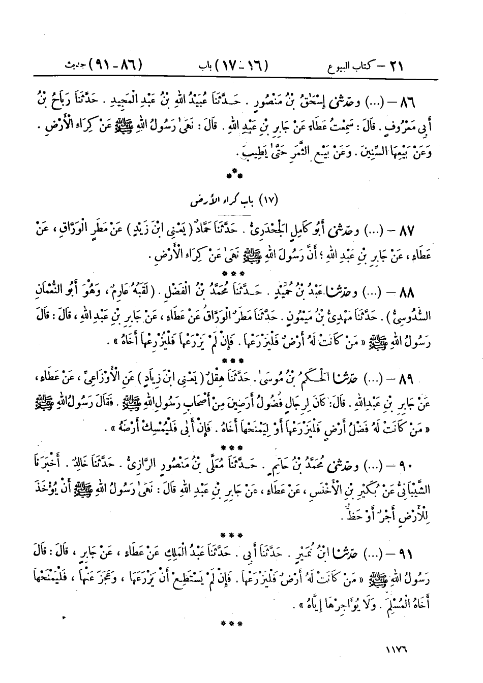 87 - (1536) وحَدَّثَنِي أَبُو كَامِلٍ الْجَحْدَرِيُّ، حَدَّثَنَا حَمَّادٌ يَعْنِي ابْنَ زَيْدٍ، عَنْ مَطَرٍ الْوَرَّاقِ، عَنْ عَطَاءٍ، عَنْ جَابِرِ بْنِ عَبْدِ اللهِ، «أَنَّ رَسُولَ اللهِ صَلَّى اللهُ عَلَيْهِ وَسَلَّمَ §نَهَى عَنْ كِرَاءِ الْأَرْضِ»